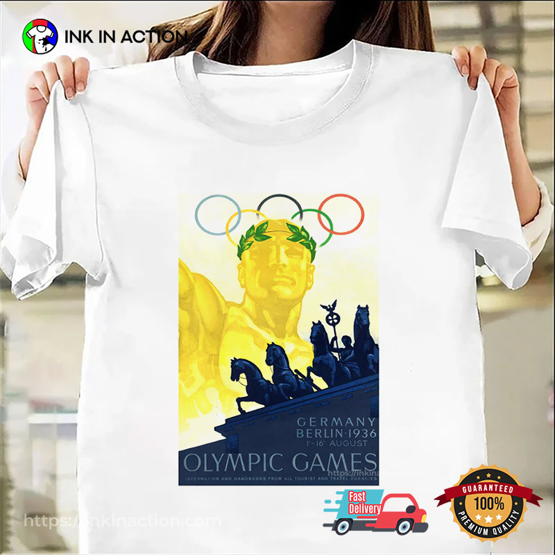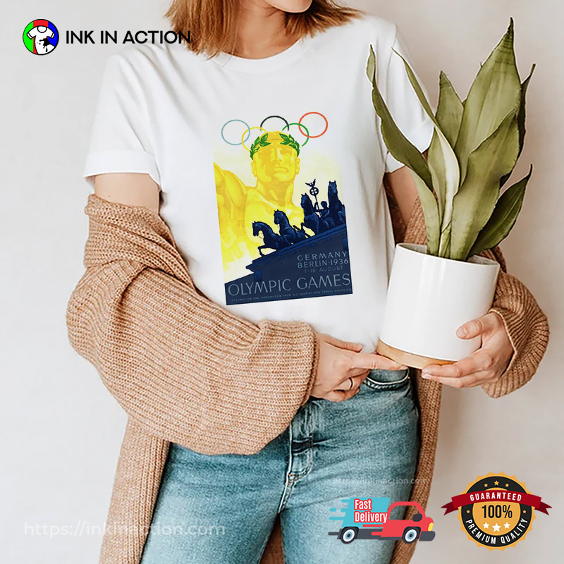 The 1936 Berlin Olympic Games Retro Shirt pays tribute to a defining moment in international sports history—the 1936 Summer Olympics held in Berlin. This edition of the Games is remembered not only for its масштаб global attention but also for its distinctive visual identity, influenced by bold 1930s design and Art Deco styling. The shirt reflects that vintage character through classic lettering and heritage-inspired graphics reminiscent of original event posters.