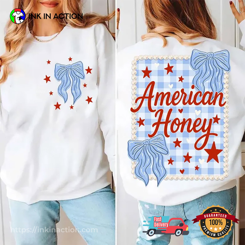 Are you ready to celebrate the holiday season with style and ease? Look no further! Our American Honey Flag Bows Coquette 2 Sided T-shirt, printed right here in the USA, offers affordable and practical options that will make your life stress-free and your celebrations unforgettable.