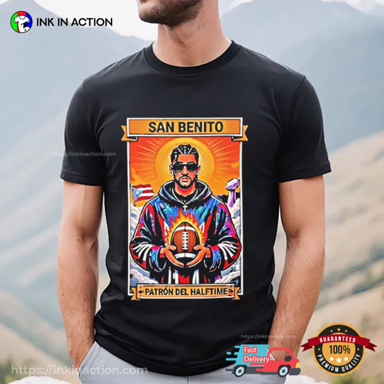 Welcome to Ink In Action, your go-to print-on-demand website for the Bad Bunny Super Bowl 2026 San Benito Patron Del Halftime T-shirt. We offer a wide selection of sports shirts for various sports enthusiasts, from golfers to basketball fans.