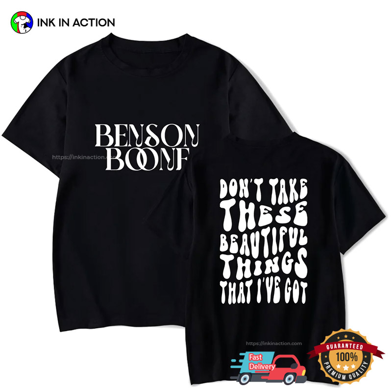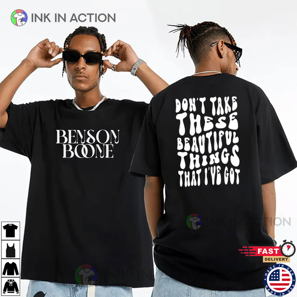 Show your love for rising star Benson Boone with our fan-favorite Benson Boone Beautiful Things Lyrics 2-sided T-shirt — designed for those who connect with his heartfelt lyrics and powerful voice. Made from soft, premium cotton, it’s perfect for concerts, casual outings, or everyday wear. A must-have tee for fans who want to carry Benson’s music and spirit wherever they go.