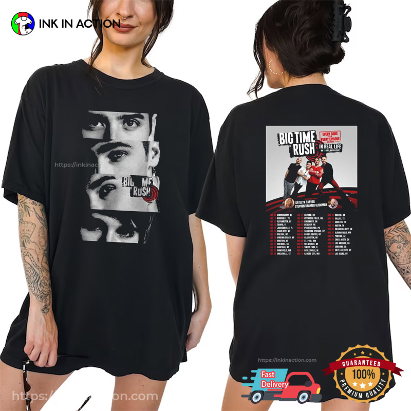 Attention music lovers, let’s check out our Big Time Rush In Real Life Tour 2025 Schedules 2-sided T-shirt, proudly printed in the USA by InkInAction.com. With its unique and eye-catching design, this shirt is sure to turn heads and start conversations.
