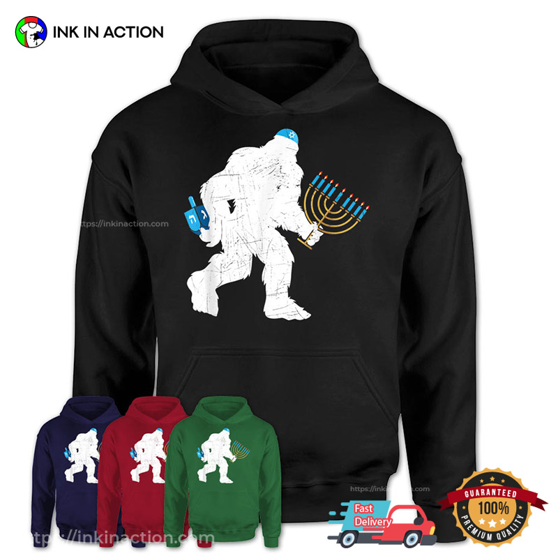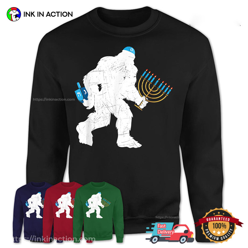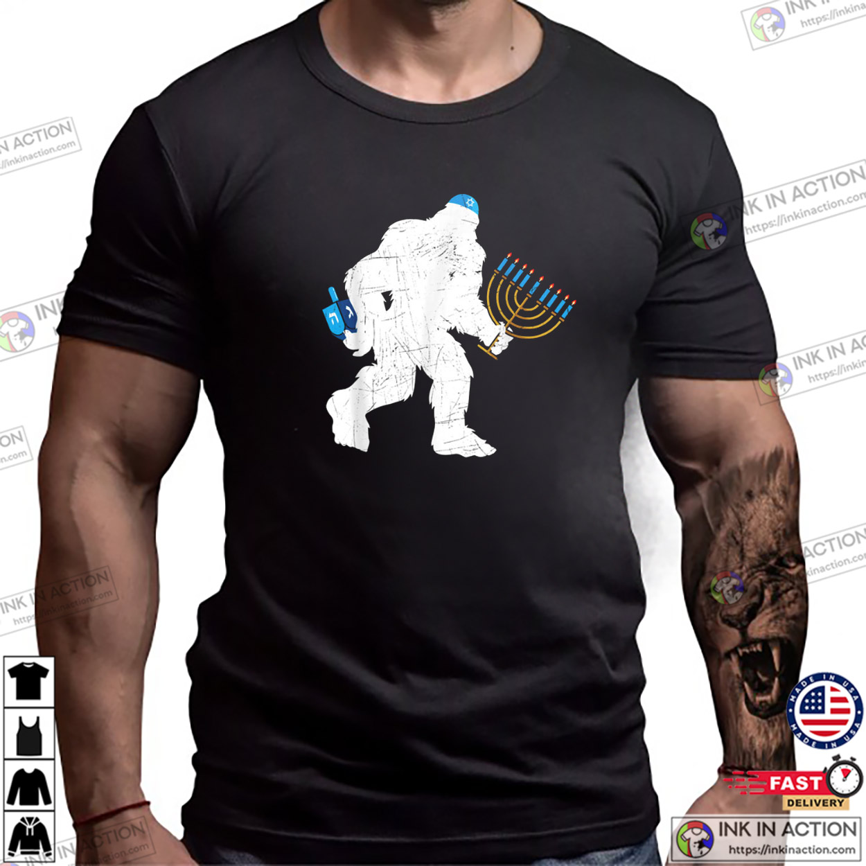 This Bigfoot Menorah Candles Funny Happy Hanukkah T-shirt features a festive design with the words wishing Happy Hanukkah in Hebrew or English. Wearing this Hanukkah T-shirt is a great way to start a conversation about the holiday with others, and to share your holiday cheer. So put on your Hanukkah shirts and get ready to celebrate!