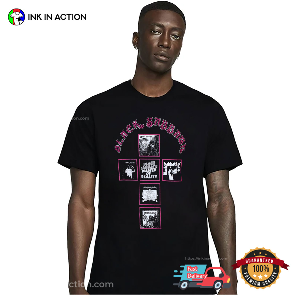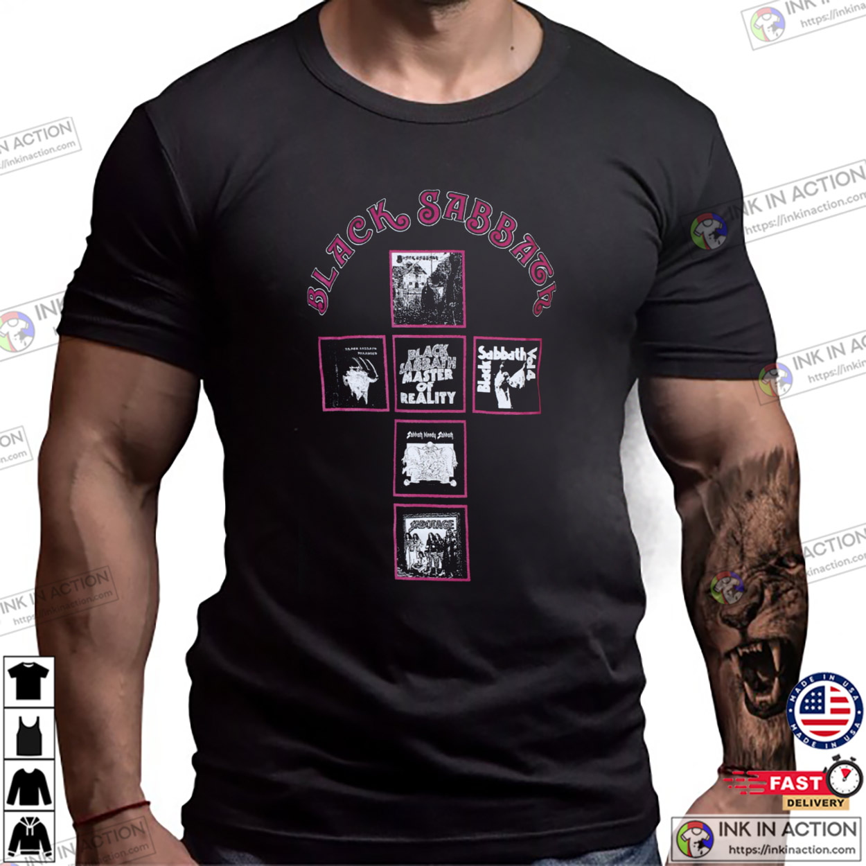 Attention music lovers, let’s check out our Black Sabbath Album Covers Crucifix Shirt, proudly printed in the USA by InkInAction.com. With its unique and eye-catching design, this shirt is sure to turn heads and start conversations.