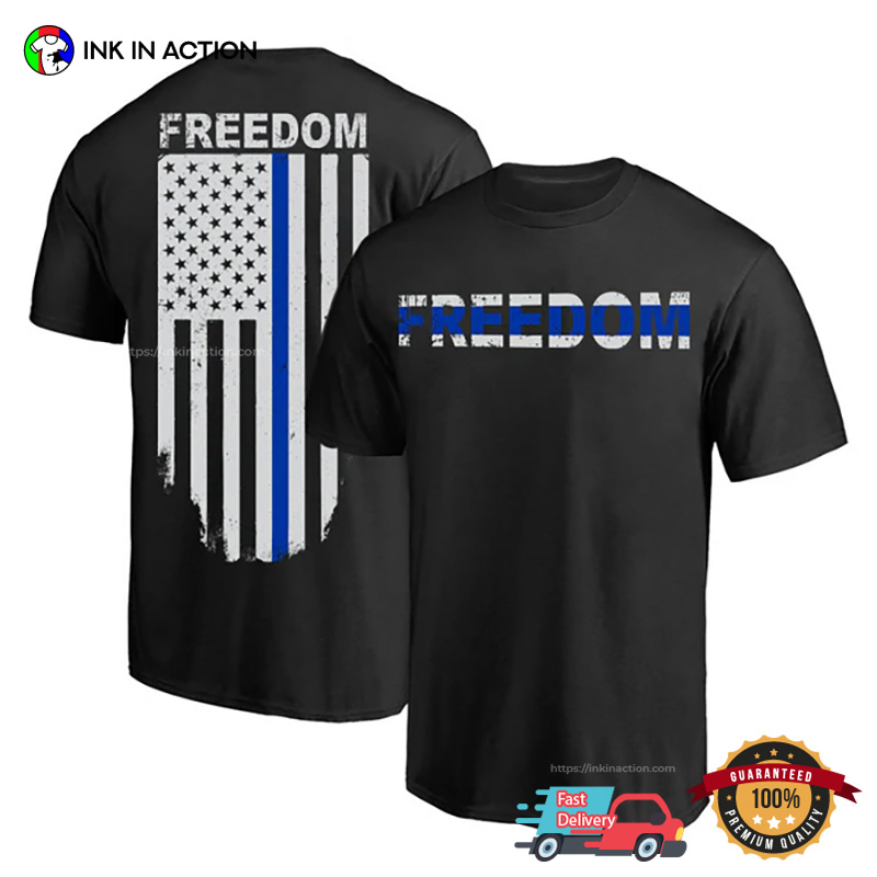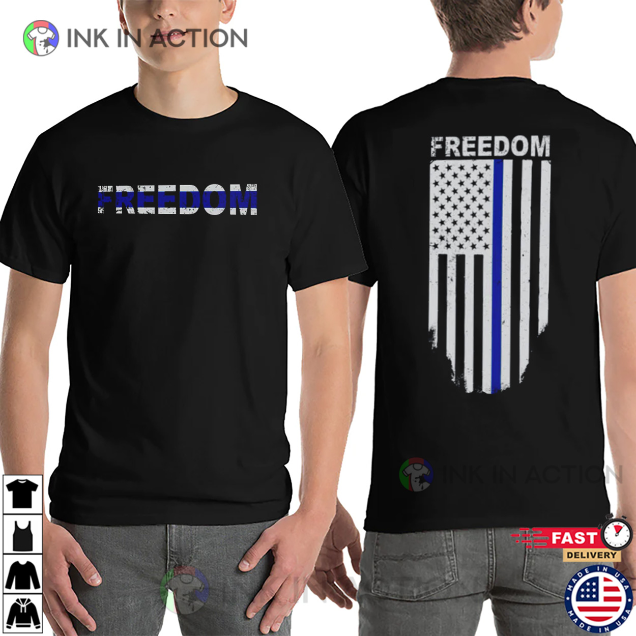 Blue Line Freedom America Flag 2-sided T-shirt: Wear your liberty with pride.