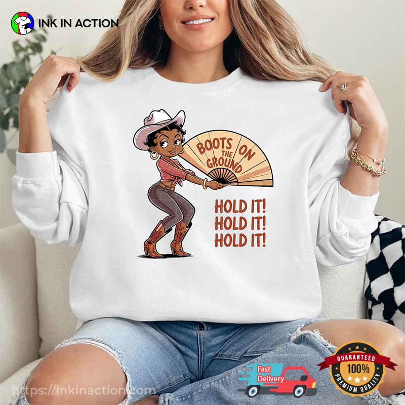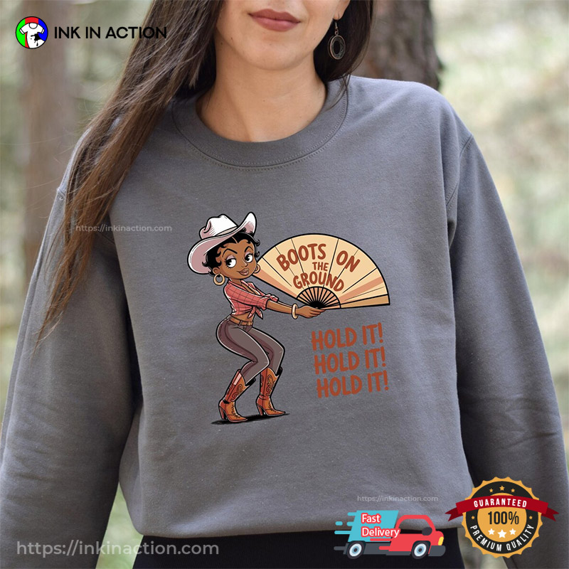 In the ever-evolving fashion world, staying on trend is not just a choice; it’s a statement. Our Boots On The Ground Hold It Cartoon Cowgirl Comfort Colors T-shirt is more than garments; they are canvases of self-expression, reflecting the spirit of the times. We understand that fashion is a language, and our trending shirts speak volumes.