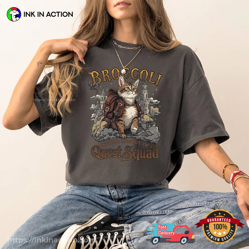 The Basgiath War College, Broccoli The Cat, Fantasy Romance, Fourth Wing Novel, Quest Squad category applies to this Broccoli Official Mascot Of Quest Squad Comfort Colors T-shirt.