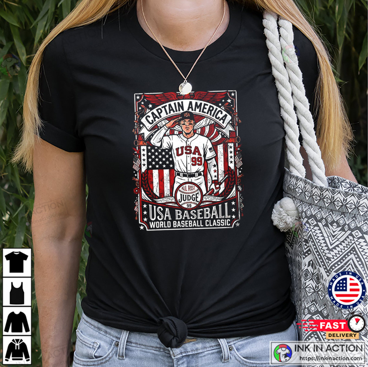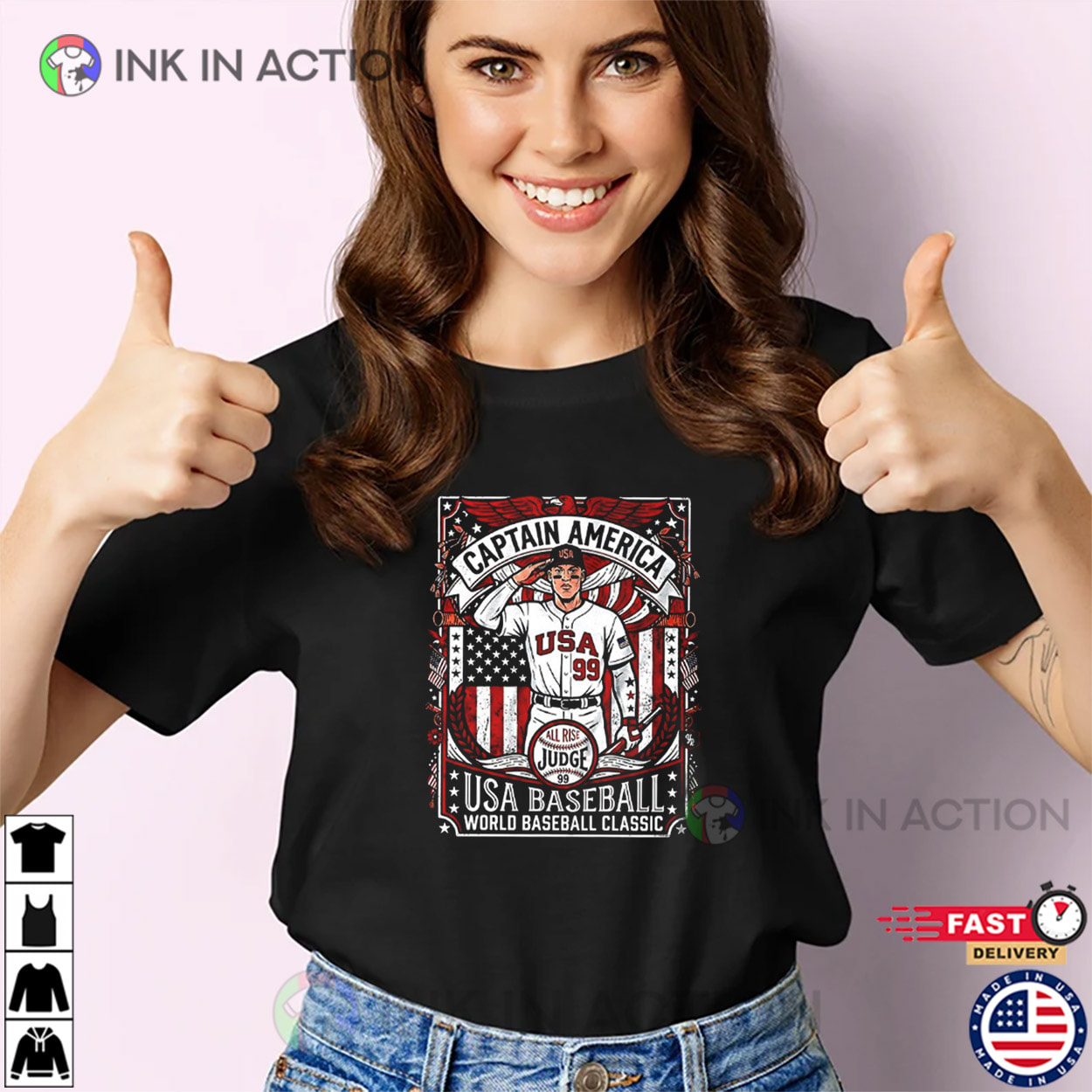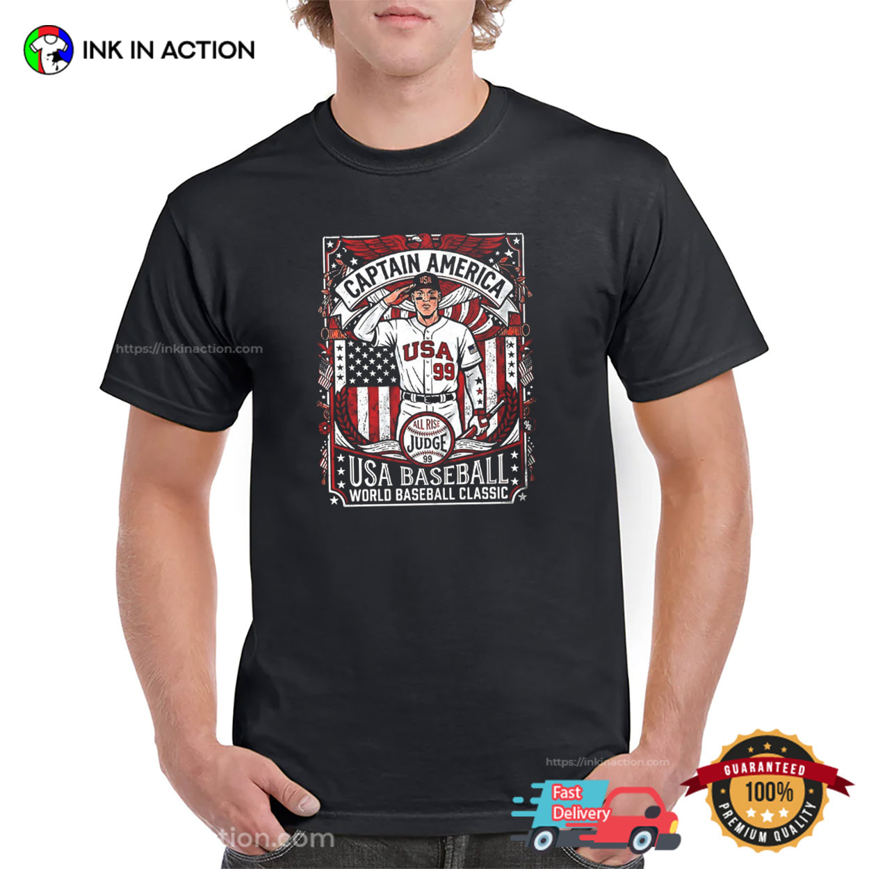 Check out this Ink In Action Baseball T-shirt! Our Captain America USA Baseball Retro Graphic Shirt is perfect for any Baseball Team fan, whether you’re looking to show your support at the game or just want to show your team pride. This shirt is a must-have for any Baseball Team fan!