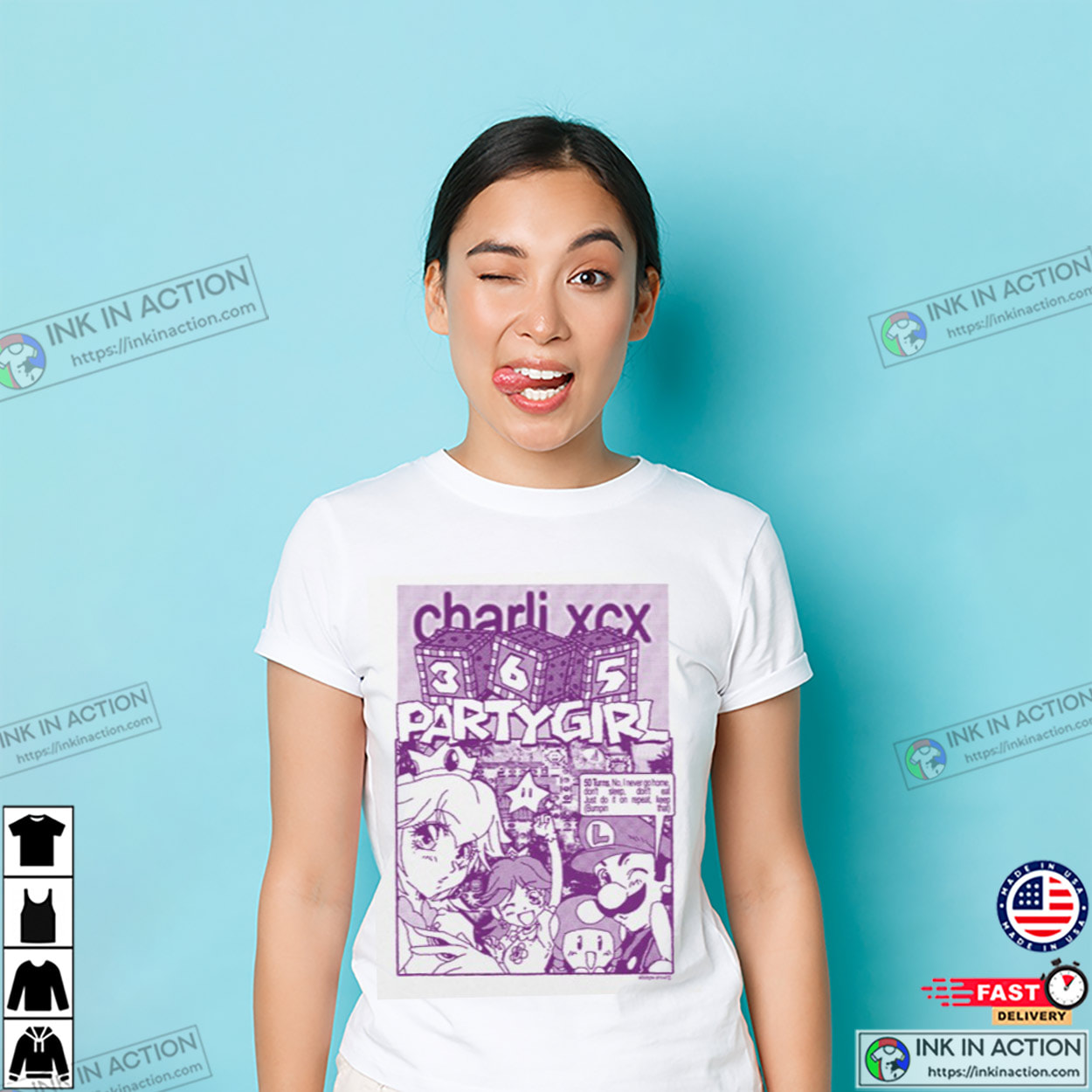 Attention music lovers, let’s check out our Charli XCX 365 Mario Party Girl T-shirt, proudly printed in the USA by InkInAction.com. With its unique and eye-catching design, this shirt is sure to turn heads and start conversations.