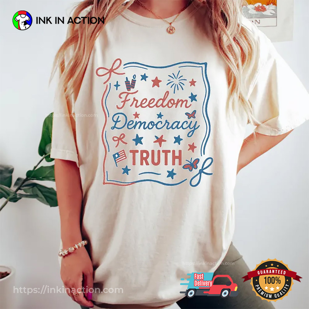 Are you ready to celebrate the holiday season with style and ease? Look no further! Our Coquette Bow 4th Of July Freedom Democracy Truth T-shirt, printed right here in the USA, offers affordable and practical options that will make your life stress-free and your celebrations unforgettable.