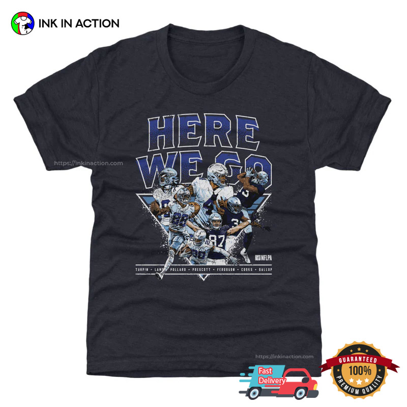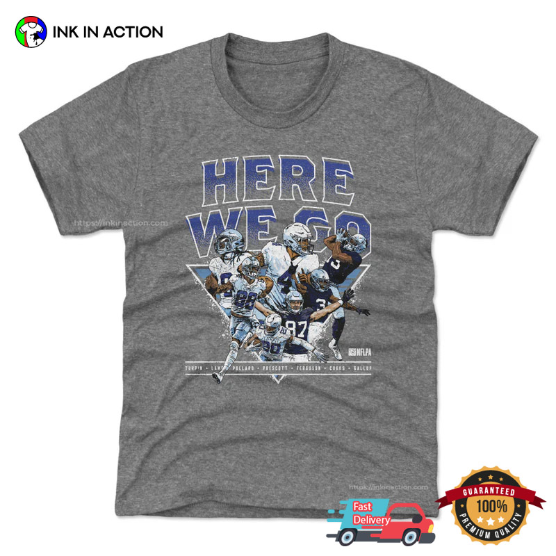 The dak prescott, dallas cowboys, football, NFL category applies to these Dak Prescott Dallas Team Here We Go T-shirt.