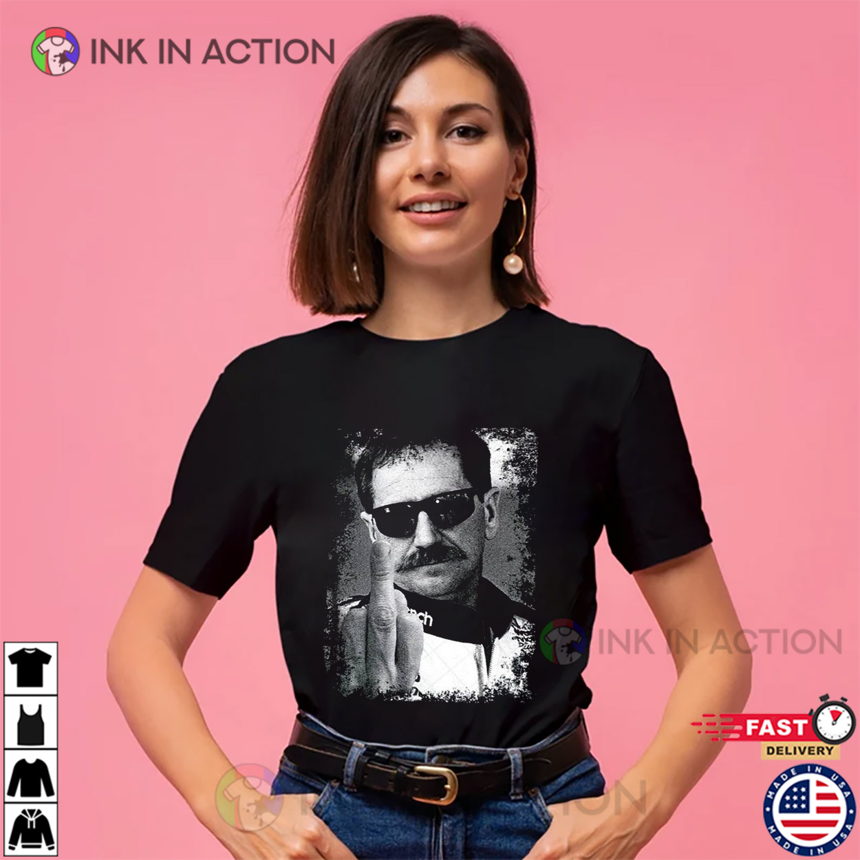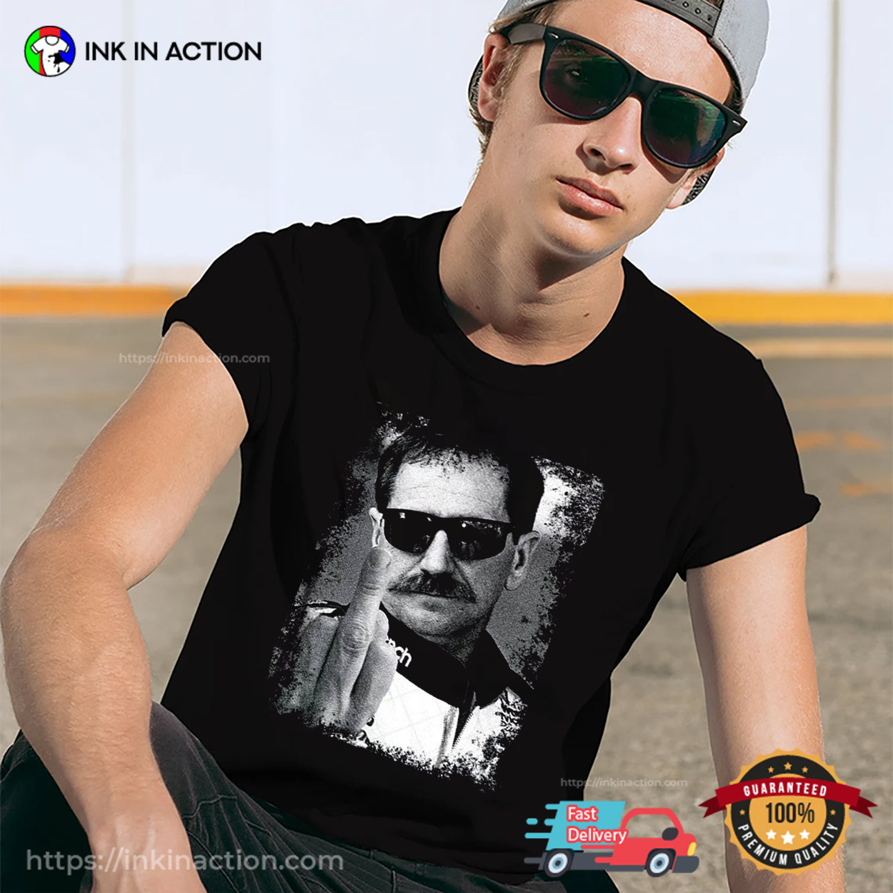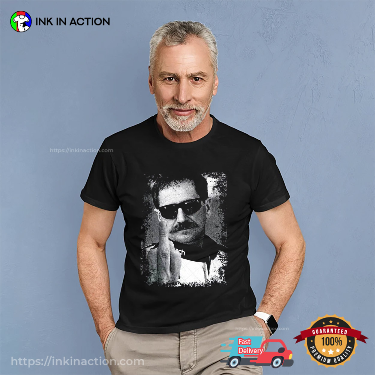 Our team prints each Dale Earnhardt Middle Finger Funny T-shirt carefully. Our shirts are always soft and durable since we print with high-quality, water-based inks and employ traditional hand-screen printing procedures.