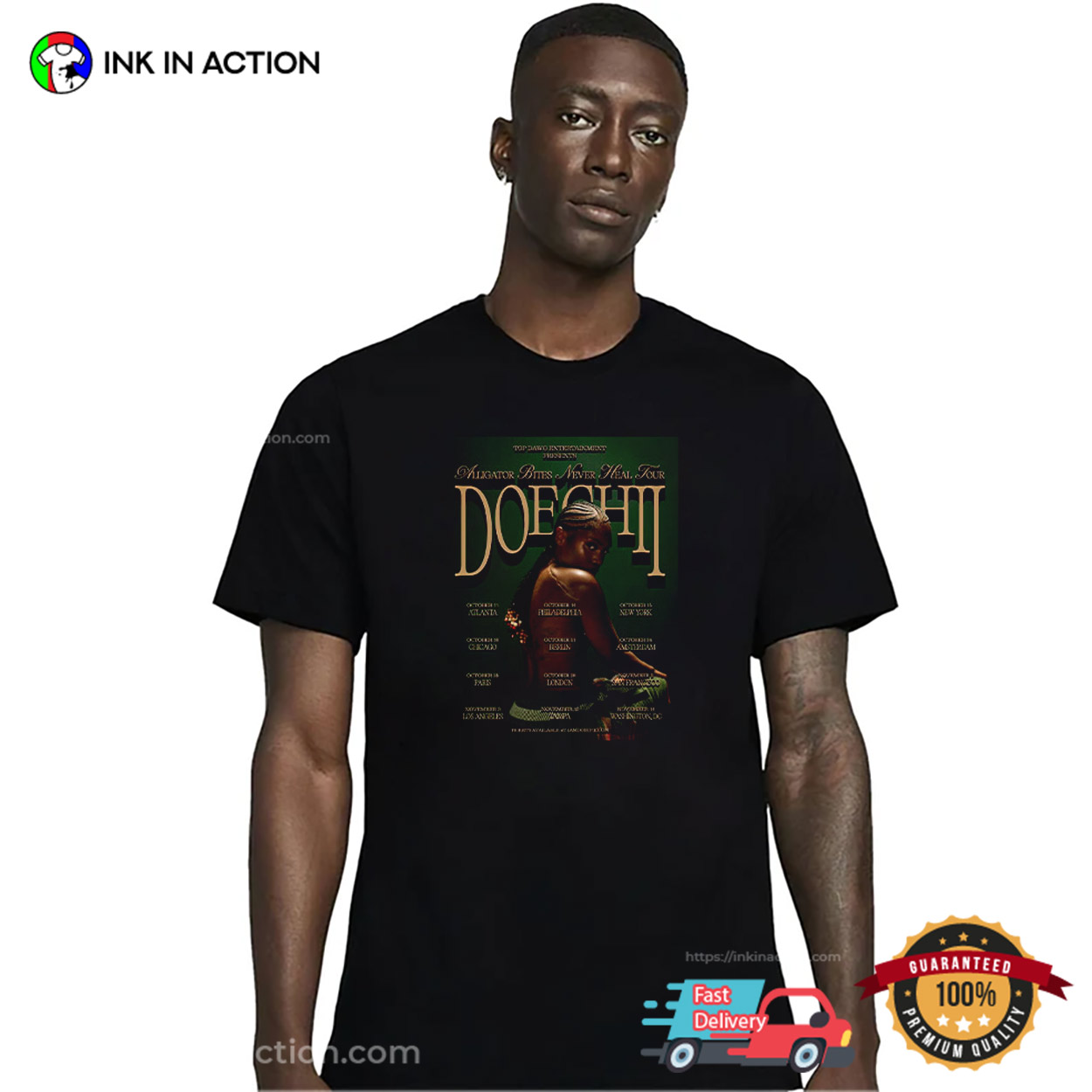 Attention music lovers, let’s check out our Doechii Alligator Bites Never Heal Tour T-shirt, proudly printed in the USA by InkInAction.com. With its unique and eye-catching design, this shirt is sure to turn heads and start conversations.