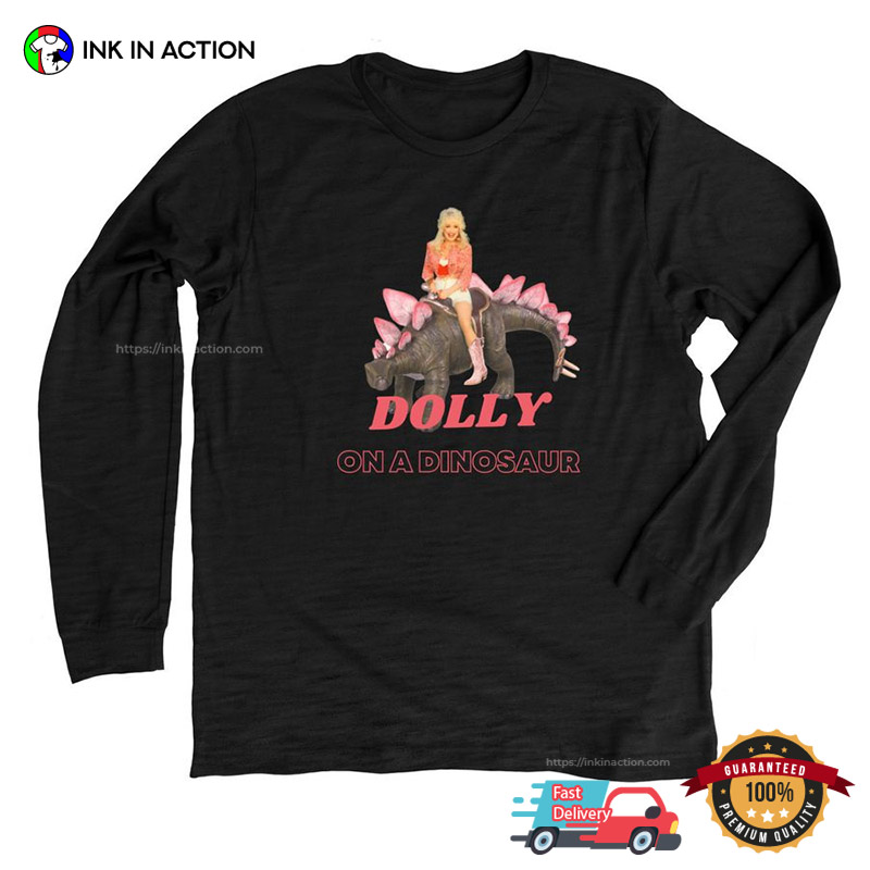 Attention music lovers, let’s check out our Dolly On A Dinosaur, Dolly Parton Cartoon Graphic T-shirt, proudly printed in the USA by InkInAction.com. With its unique and eye-catching design, this shirt is sure to turn heads and start conversations.