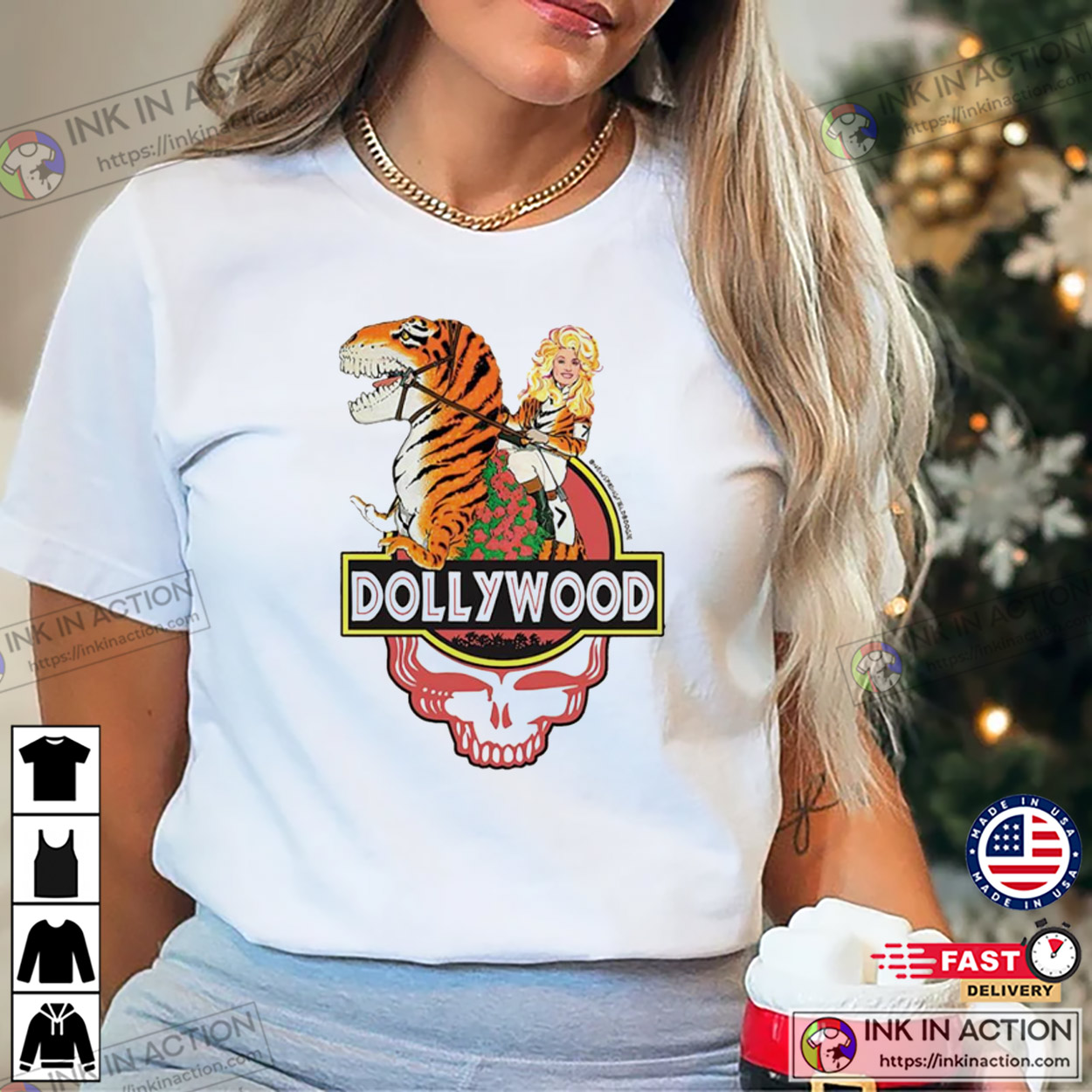 Attention music lovers, let’s check out our Dollywood Dolly Parton Dinosaur Retro Animation T-shirt, proudly printed in the USA by InkInAction.com. With its unique and eye-catching design, this shirt is sure to turn heads and start conversations.