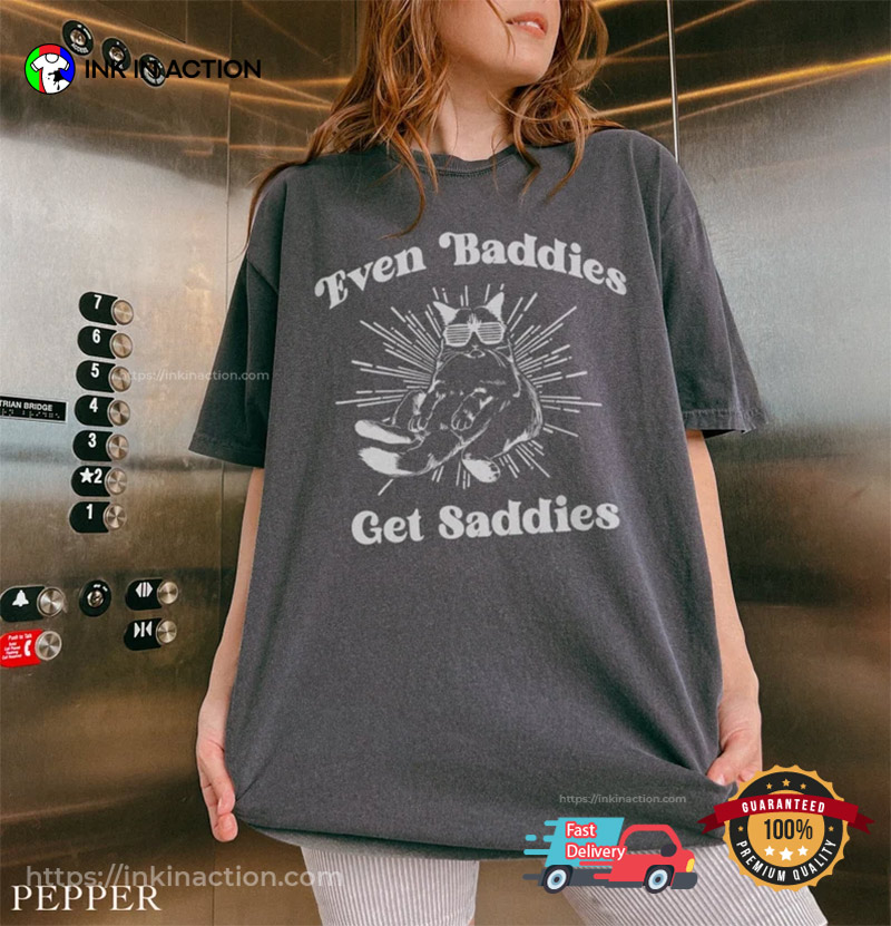 The adult humor, Funny Meme, Funny Pets, Funny T-shirt, Humor T-shirt, Parody T-shirt category applies to this Even Baddies Get Saddies Funny Mental Health Quote Comfort Colors Tee.