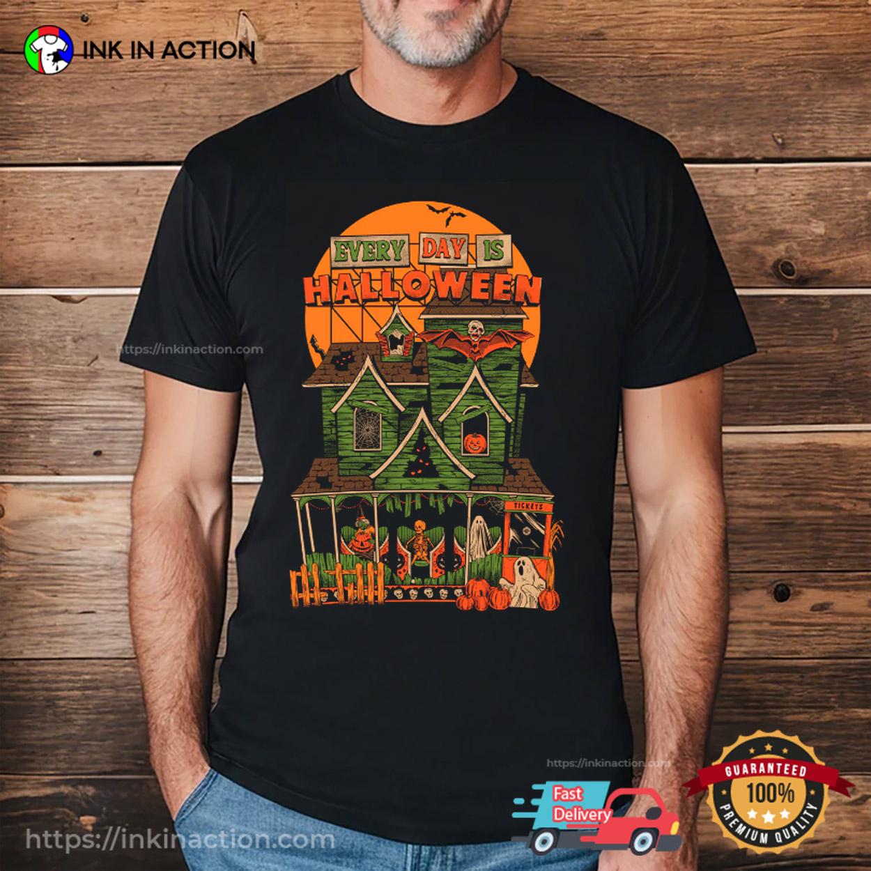 Are you ready to step into the spooky season with style and flair? Look no further than our EVERY DAY IS HALLOWEEN Ghost House Graphic Tee at InkInAction.com! With a wide range of designs and styles, we’ve got something for everyone to enjoy this Halloween.