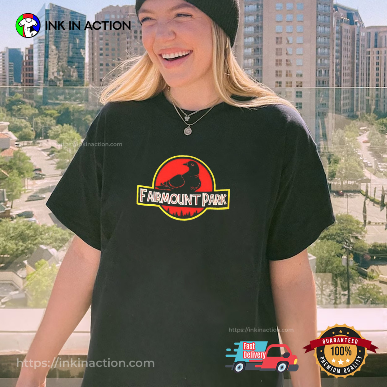 Looking for a statement piece that keeps you stylish and comfortable all year round? Our Fairmount Park Parody Jurassic Park Tee is designed for those who love to stand out and express themselves through fashion-forward designs, pop culture references, and iconic graphics.