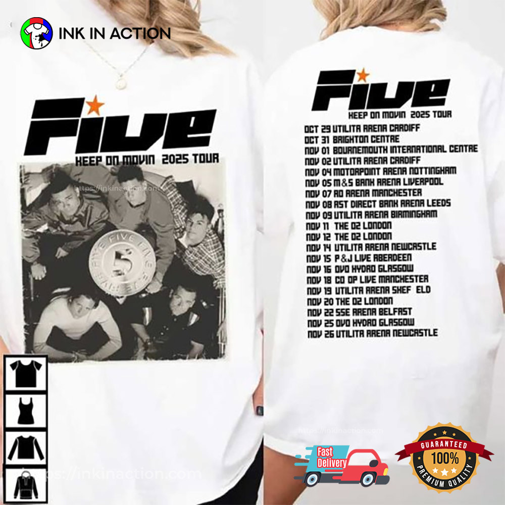 Attention music lovers, let’s check out our Five Boy Band Keep On Movin 2025 UK Tour T-shirt , proudly printed in the USA by InkInAction.com. With its unique and eye-catching design, this shirt is sure to turn heads and start conversations.