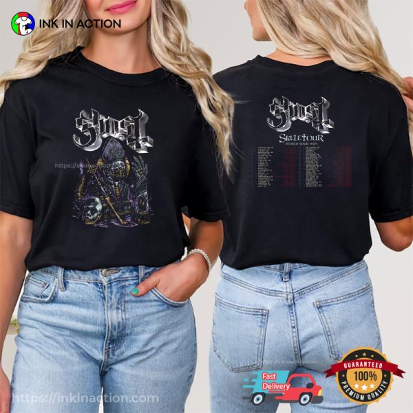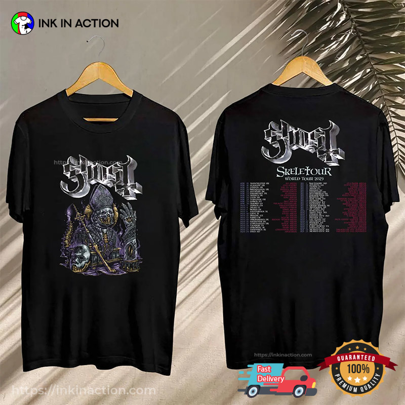 Get ready to haunt the scene with the Ghost Skeletour World Tour 2025 Schedules 2-sided T-shirt, perfect for fans of heavy riffs and theatrical metal. Crafted from premium, soft fabric, this tee features bold, bone-chilling tour graphics that stand out in any crowd. Embrace the dark—wear the tour, summon the spirit of metal!