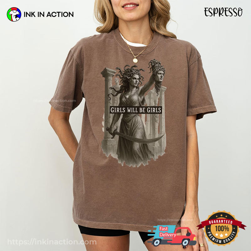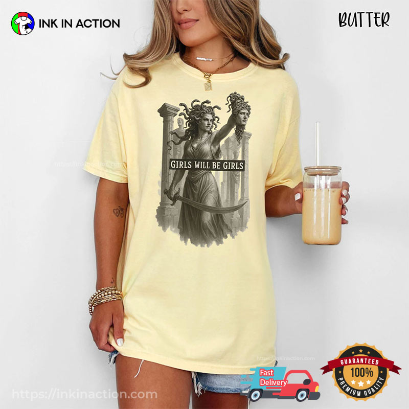 Make a powerful statement with this Girls Will Be Girls Medusa Kill Perseus Comfort Colors T-shirt, blending mythology with modern feminism. Made from soft, high-quality fabric, it features striking Medusa artwork that symbolizes strength and resistance. Perfect for rallies, everyday wear, or sparking conversations, this tee empowers you to embrace your inner warrior. Stand tall, stay fierce—Medusa is watching!