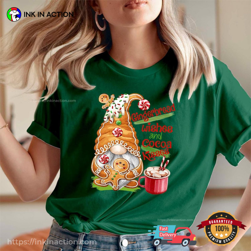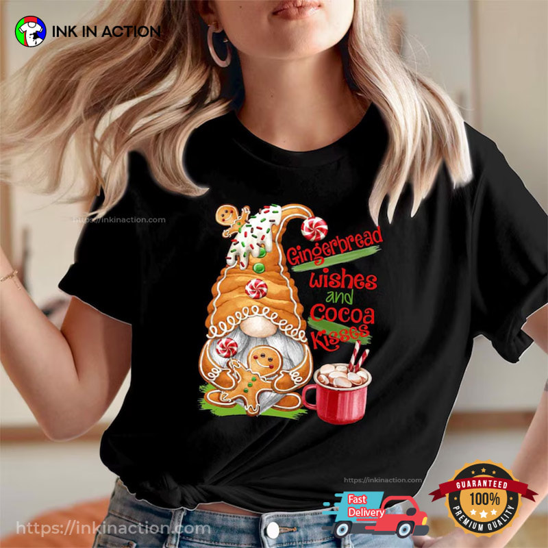 If you are looking for the perfect Christmas gift, look no further than Ink In Action’s Gnome Gingerbread Wishes And Cocoa Kisses Xmas Shirt!
