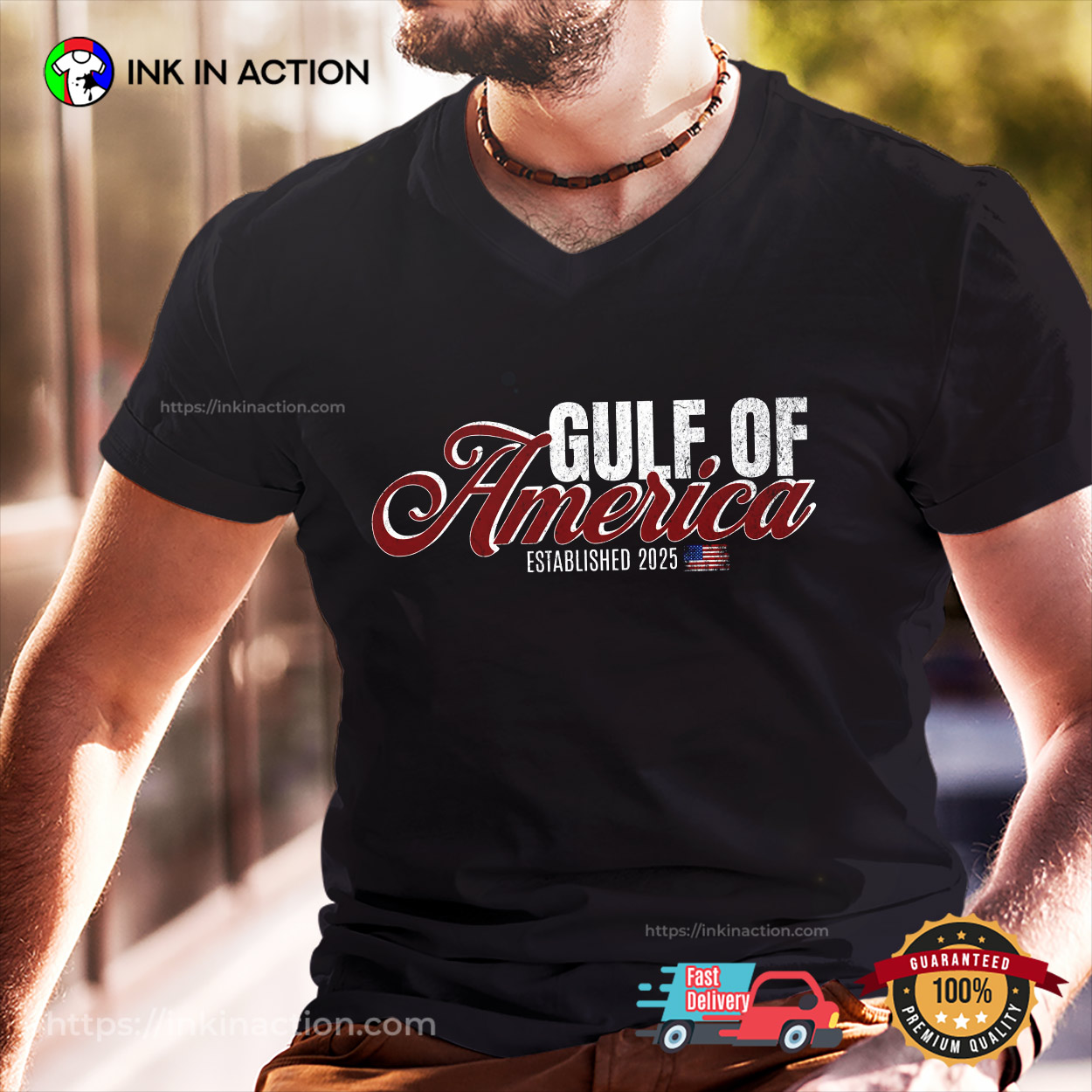 The Coastal region, Gulf of America, Gulf of Mexico, political category applies to this Gulf Of America Established 2025 Vintage T-shirt.