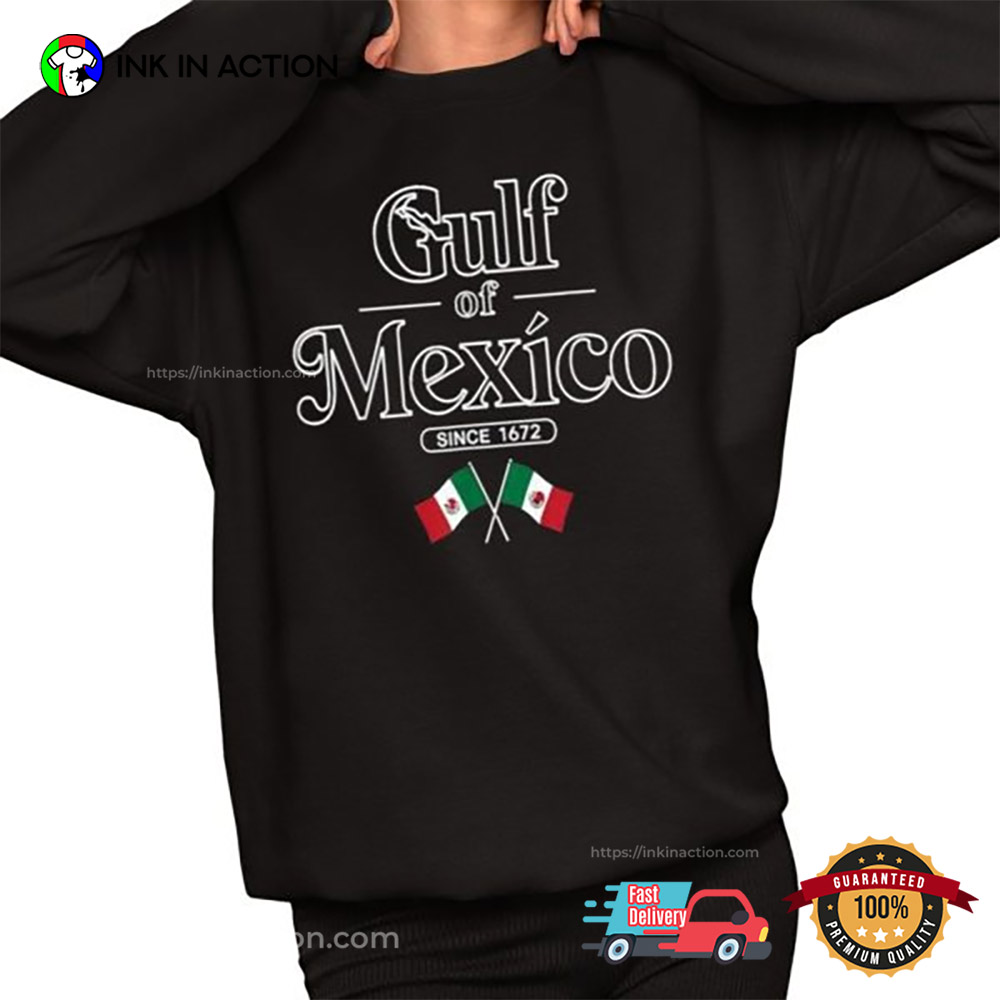 The Coastal region, Gulf of America, Gulf of Mexico, political category applies to this Gulf Of Mexico Since 1672 Mexican Flag Shirt.