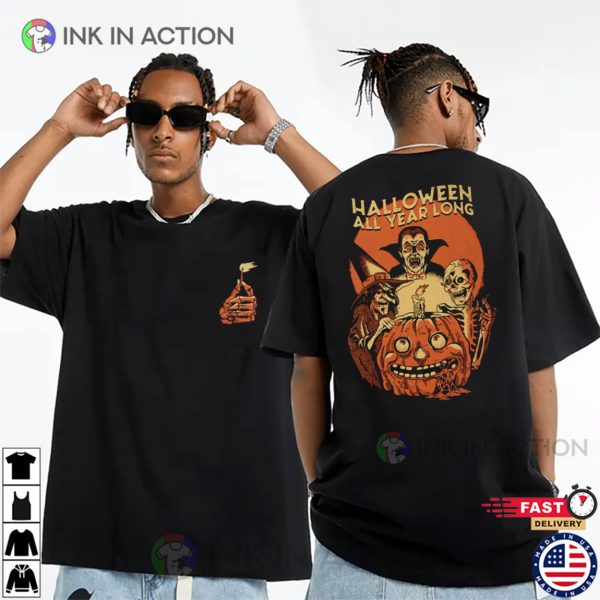 Let’s start with our cute Halloween All Year Long Vintage 2 Sided Shirt, which are perfect for adding a touch of whimsy to your holiday wardrobe. From adorable pumpkins to friendly ghosts, these shirts are sure to bring a smile to your face and delight those around you. Whether you’re trick-or-treating with the kids or attending a Halloween party, our cute designs are a must-have.