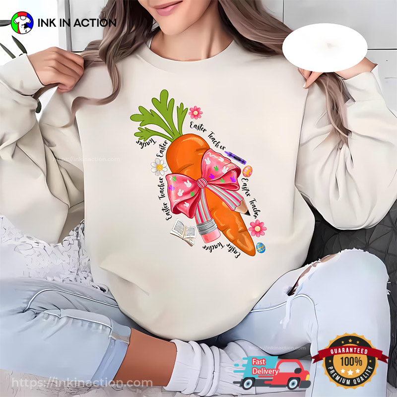 The Bunny Carrots, Happy Easter category applies to this Happy Easter Teacher Coquette Bow Pencil Cute Carrot Shirt.