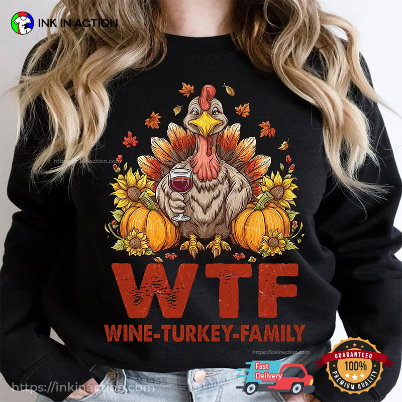 Happy Thanksgiving Funny WTF Wine-Turkey-Family T-shirt: Feast, family, and fall vibes.