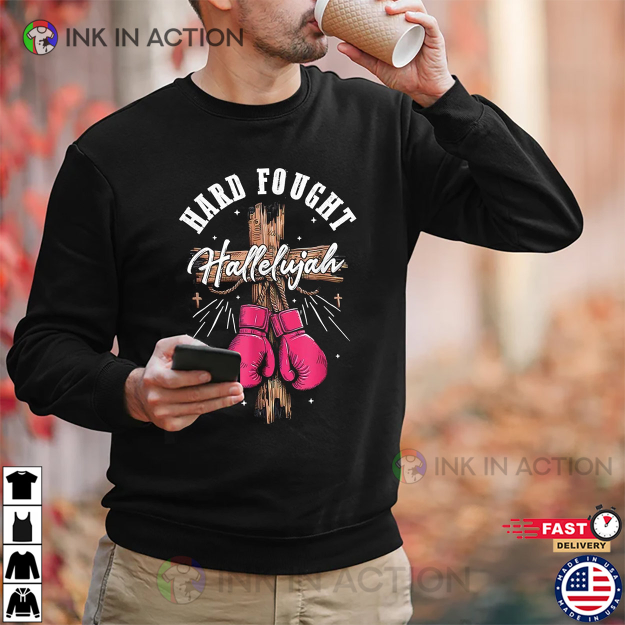With Ink In Action’s Hard Fought Hallelujah Jesus Fighter T-shirt, you may go out with your pals in style. Have you ever been giddy about great trending t-shirts? Want something that will keep you consistently warm on those long, chilly nights? So stop looking now! You own this Hard Fought Hallelujah Jesus Fighter T-shirt.