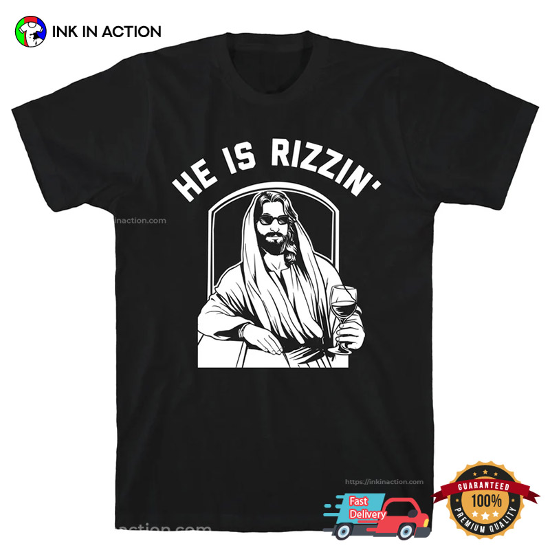 With Ink In Action’s He Is Rizzin’ Wine Jesus Meme Tee, you can go out with your pals in style.
