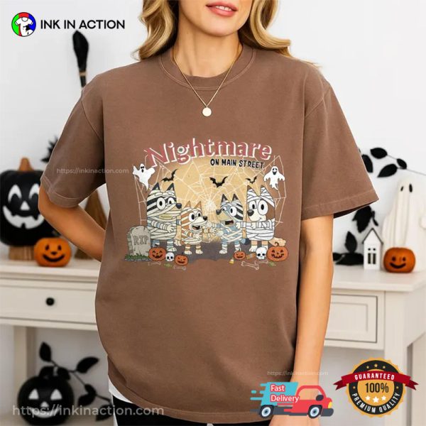 Let’s start with our Horror Nightmare On Main Street Bluey Spooky Comfort Colors Tee, the backbone of any spooky wardrobe. Our extensive selection features a variety of designs, ranging from playful to downright terrifying. Whether you’re looking for a shirt adorned with creepy pumpkins, eerie skeletons, or haunting ghosts, we’ve got you covered. Our Halloween shirts are perfect for parties, trick-or-treating, or simply embracing the spirit of the season.
