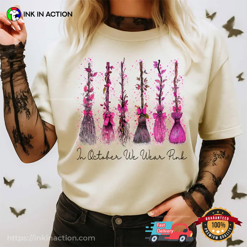 In October We Wear Pink Halloween Witch’s Brooms Comfort Colors Tee
