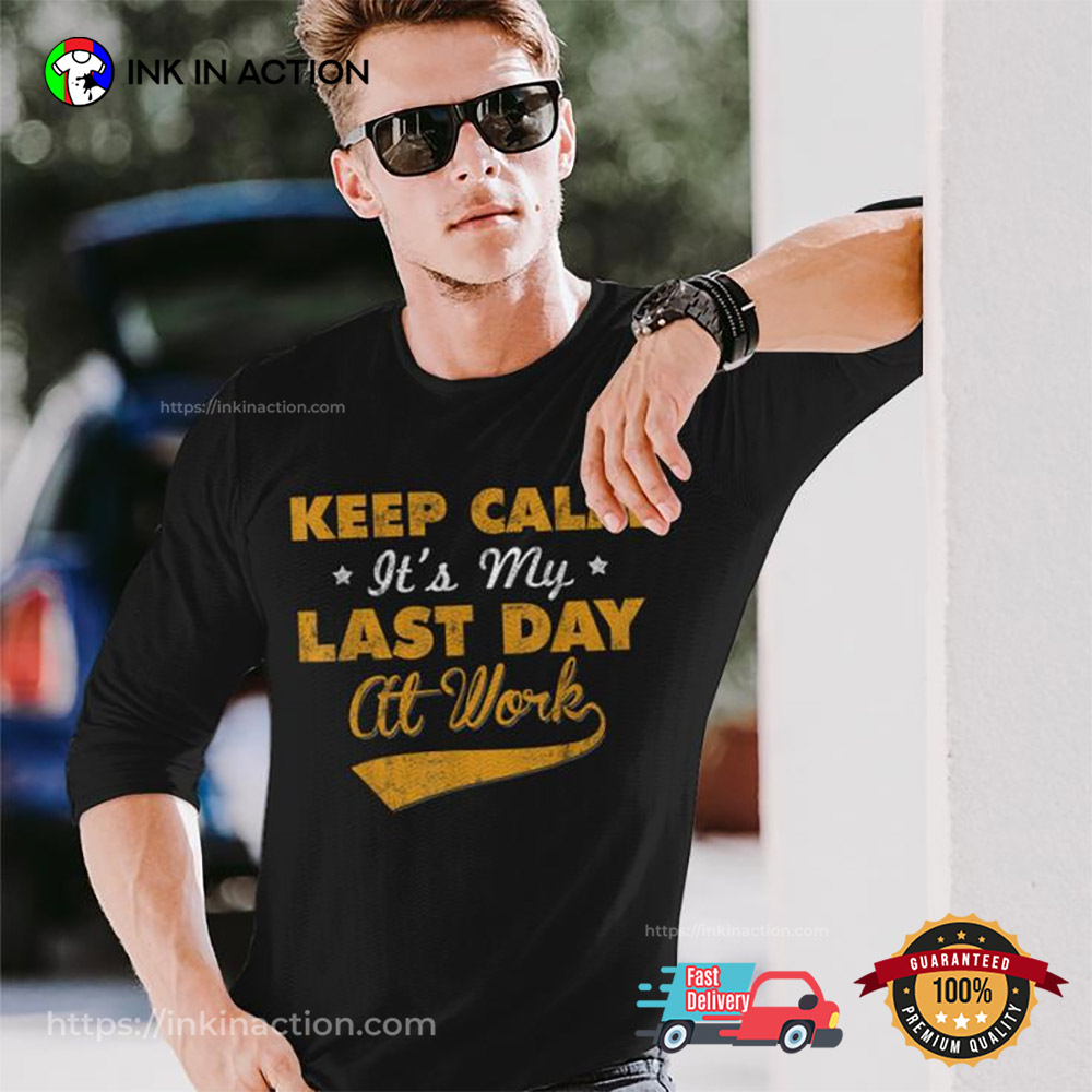 Don’t miss out on the latest trends – grab your Keep Calm It’s My Last Day Of Work T-shirt today and make a statement!