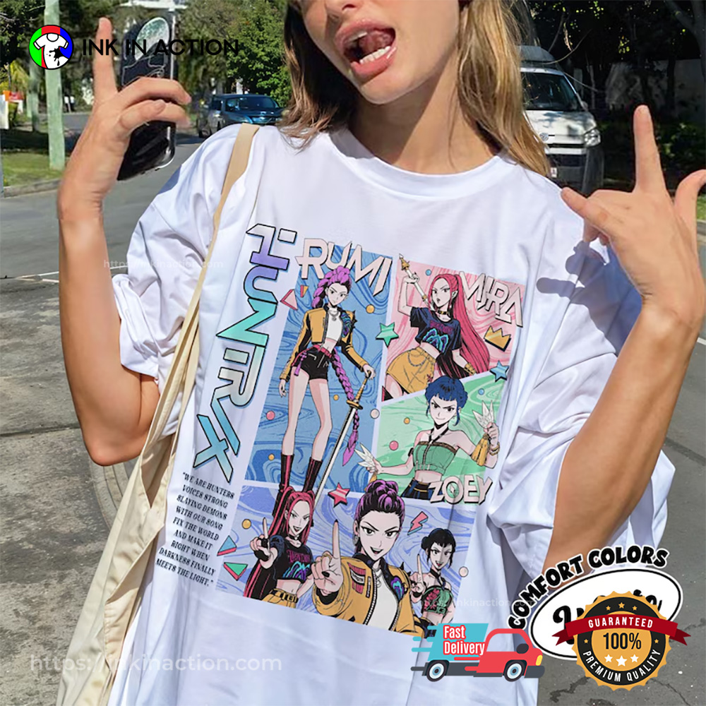 Welcome to InkInAction.com, where style meets cinema. If you’re a movie enthusiast, fashion-forward individual, or simply someone who appreciates the power of storytelling through film, our collection of Kpop Demon Hunters Huntrix Graphic Comfort Colors Shirt is designed for you. Not only are our T-shirts inspired by iconic retro films and proudly printed in the USA, but they’re also a testament to the nostalgia and passion that movies evoke.