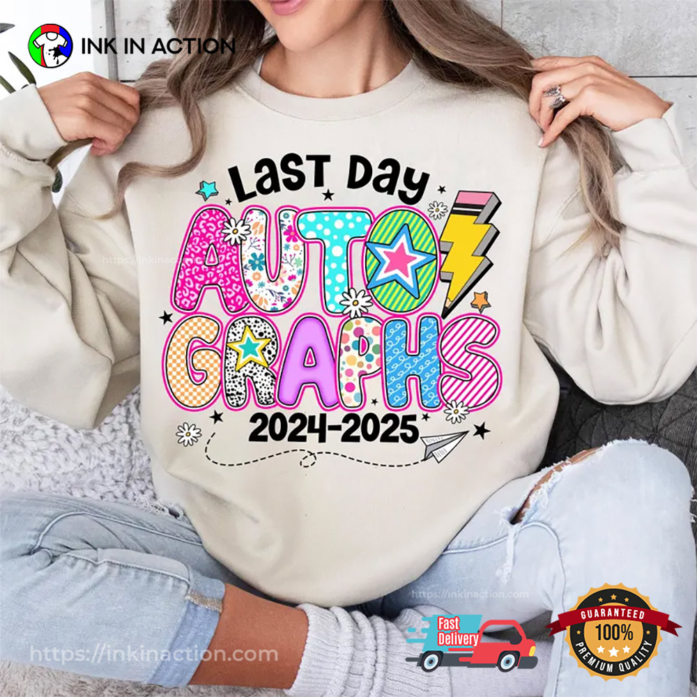 This isn’t just a T-shirt — it’s a memory in the making. Each Last Day Autographs 2024-2025 School Autographs T-shirt features bright, playful designs that capture the excitement of moving up, graduating, or simply saying “hello summer!”