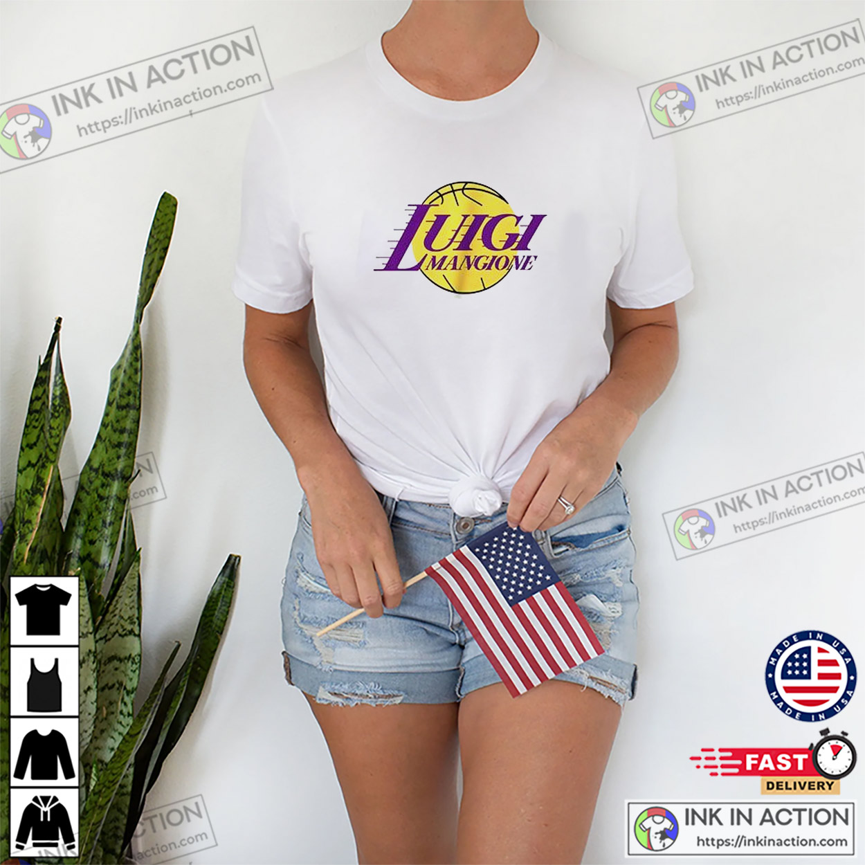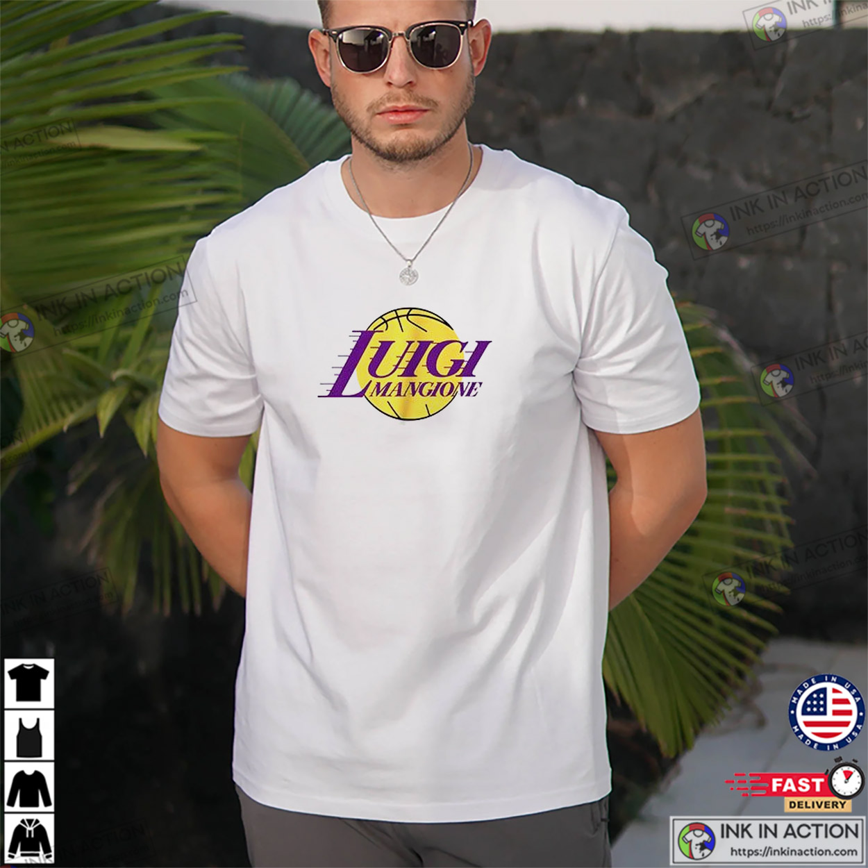 The CEO Brian Thompson, Luigi Mangione, murder, UnitedHealthcare category applies to this Los Angeles Lakers Luigi Mangione T-shirt.