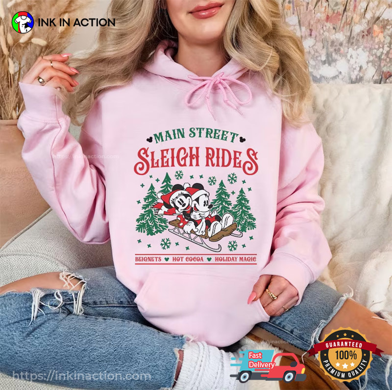 Bring the holiday magic to life with this enchanting Main Street Sleigh Rides Retro Mickey Minnie Disney Christmas T-shirts, featuring your favorite characters in festive style. Made from soft, breathable cotton, it delivers comfort and cheer for the whole season. Perfect for Disney fans, family gatherings, or park visits—celebrate Christmas with a touch of Disney wonder.