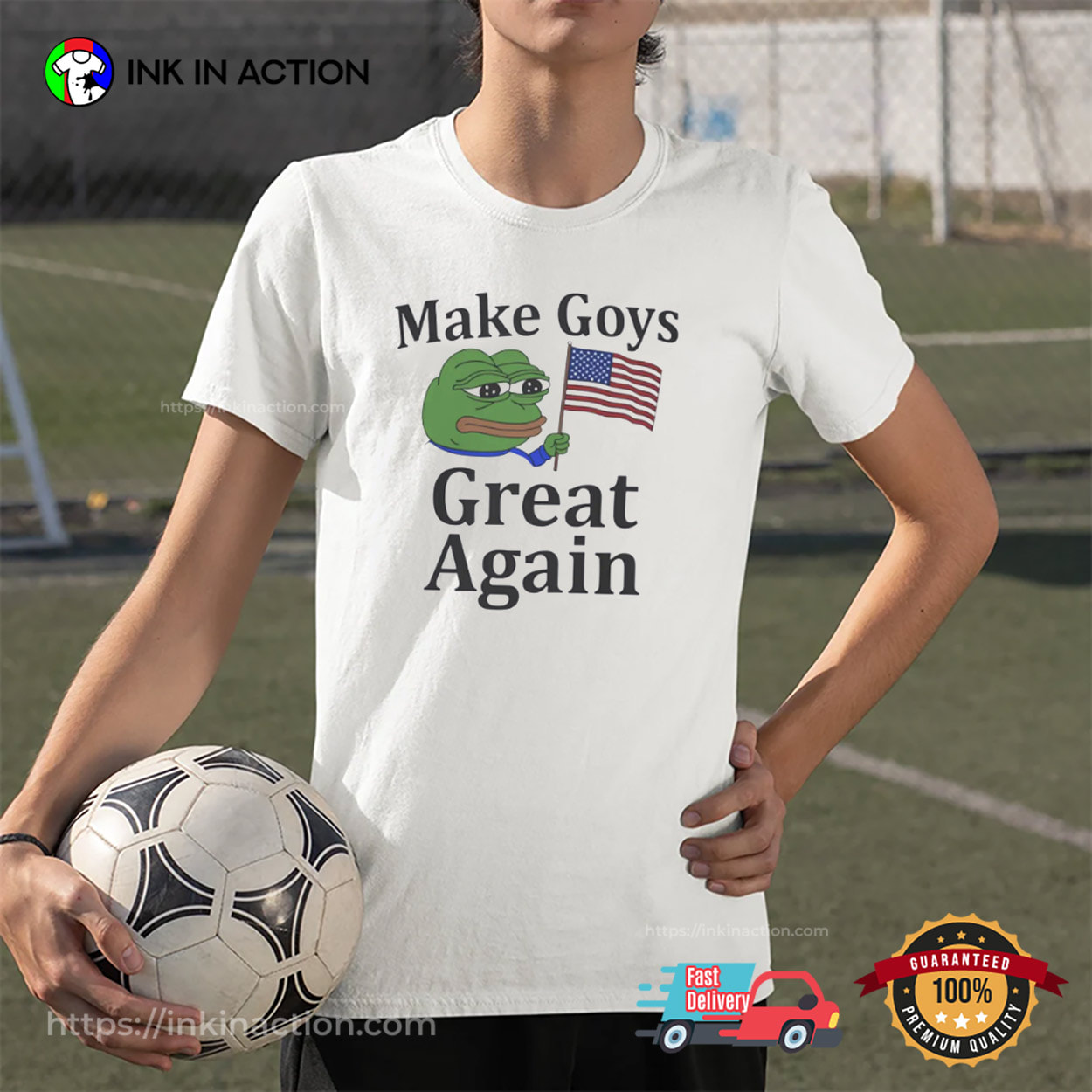 Show off your sense of humor with the Make Goys Great Again Pepe Frog Meme Shirt, perfect for fans of viral internet jokes and quirky style. Made from soft, breathable cotton, this fun tee features a hilarious frog meme graphic that instantly grabs attention and sparks laughs.