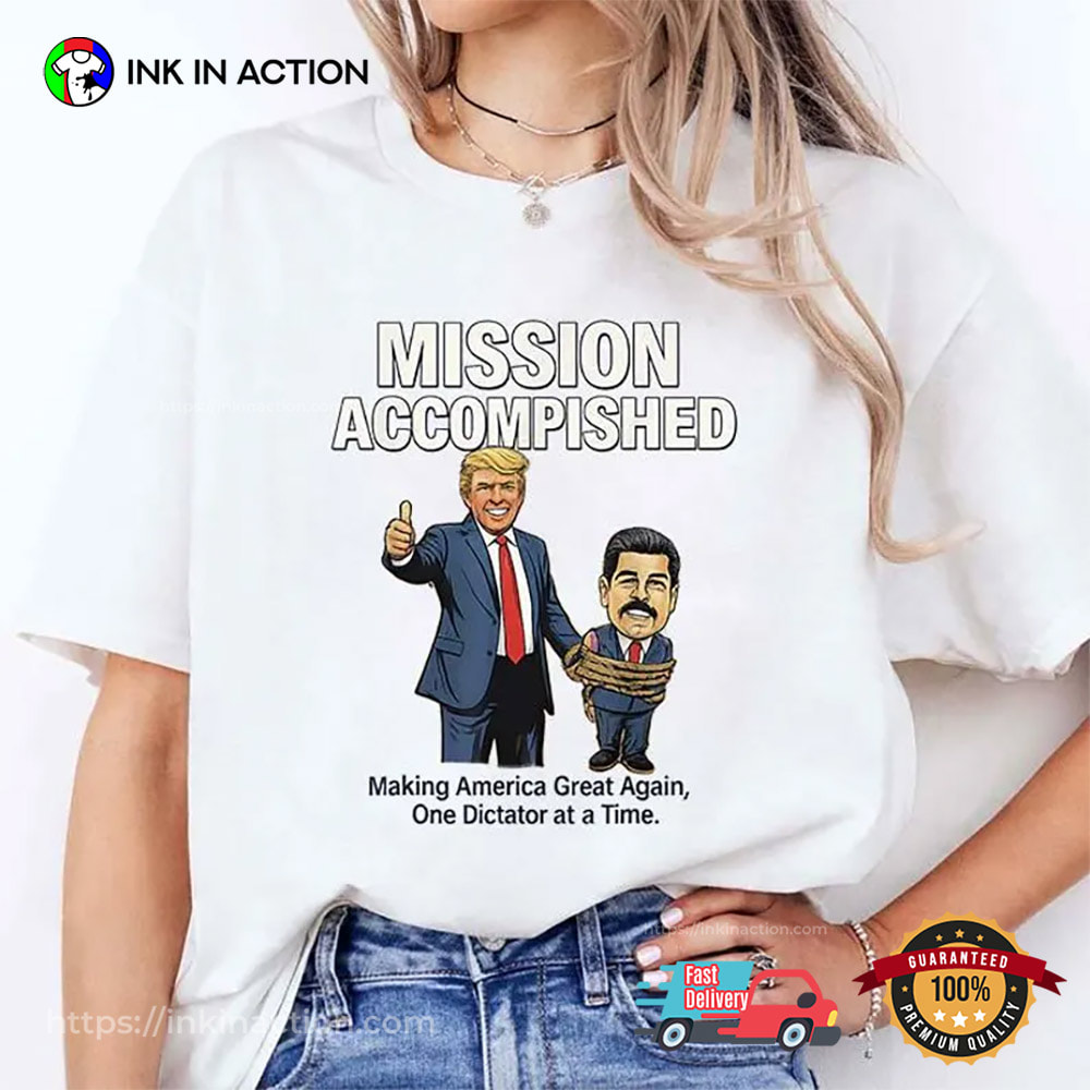 Check out our selection of Mission Accomplished Maduro Captured MAGA Shirt right away! Regardless of your political affiliation—Democrat, Republican, or Independent—we have the ideal shirt for you. All of our shirts are constructed from premium fabrics, so they will last up far past election season.