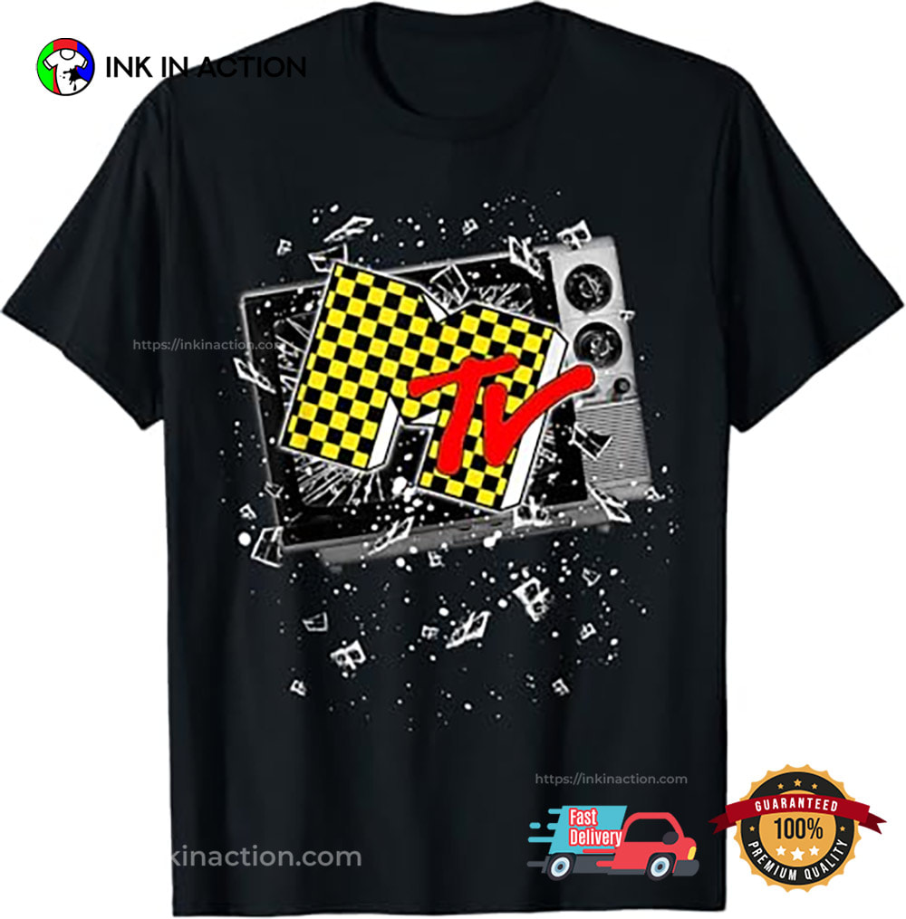 Attention music lovers, let’s check out our MTV Checker Board Breaking Tv T-shirt, proudly printed in the USA by InkInAction.com. With its unique and eye-catching design, this shirt is sure to turn heads and start conversations.