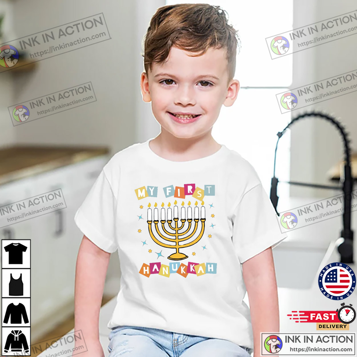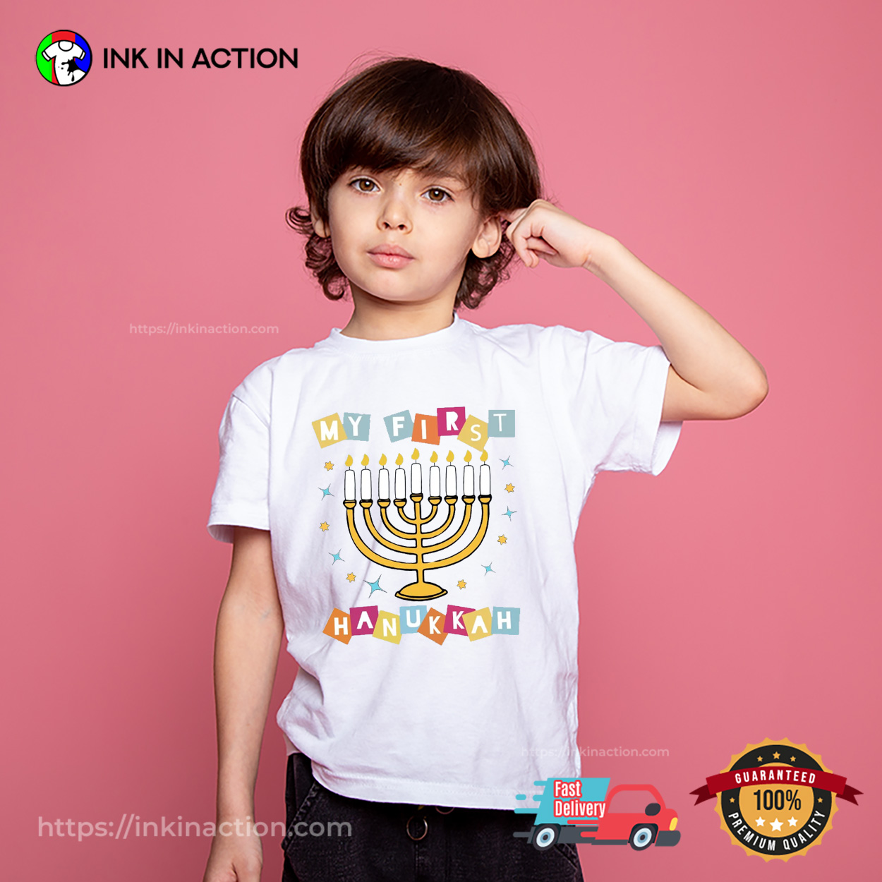 Celebrate the season of light with this festive My First Hanukkah, Menorah Candles Tee, perfect for sharing joy and tradition. Crafted from soft, high-quality cotton, it offers comfort and style for every celebration. Whether at family gatherings or holiday parties, this tee lets you wear your Hanukkah spirit with pride and warmth.