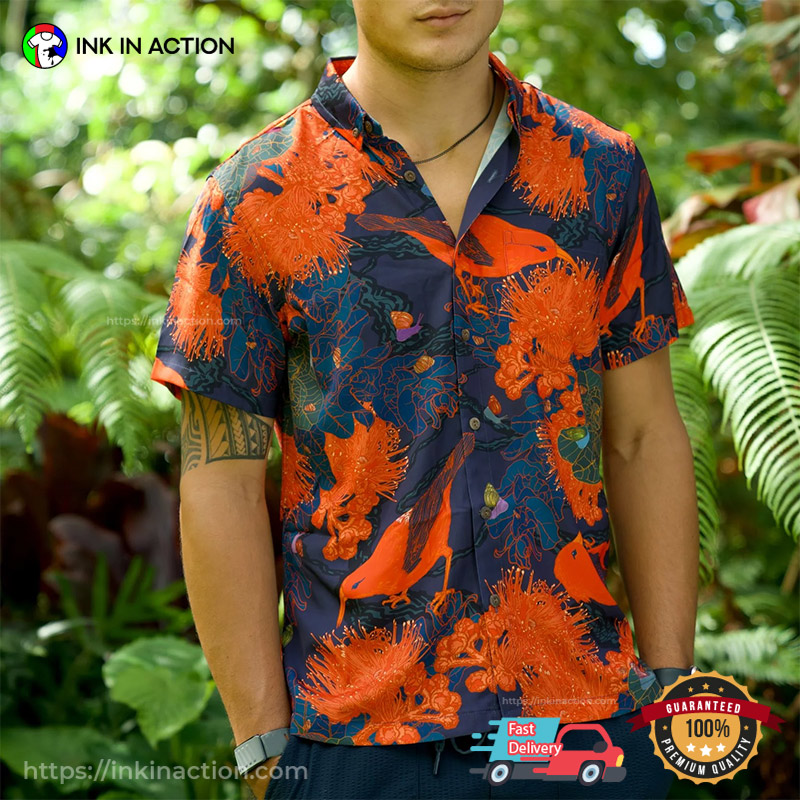 Bring the Aloha Spirit everywhere you go with Ink In Action’s Orange Bird And Flower Art Hawaiian Shirt!