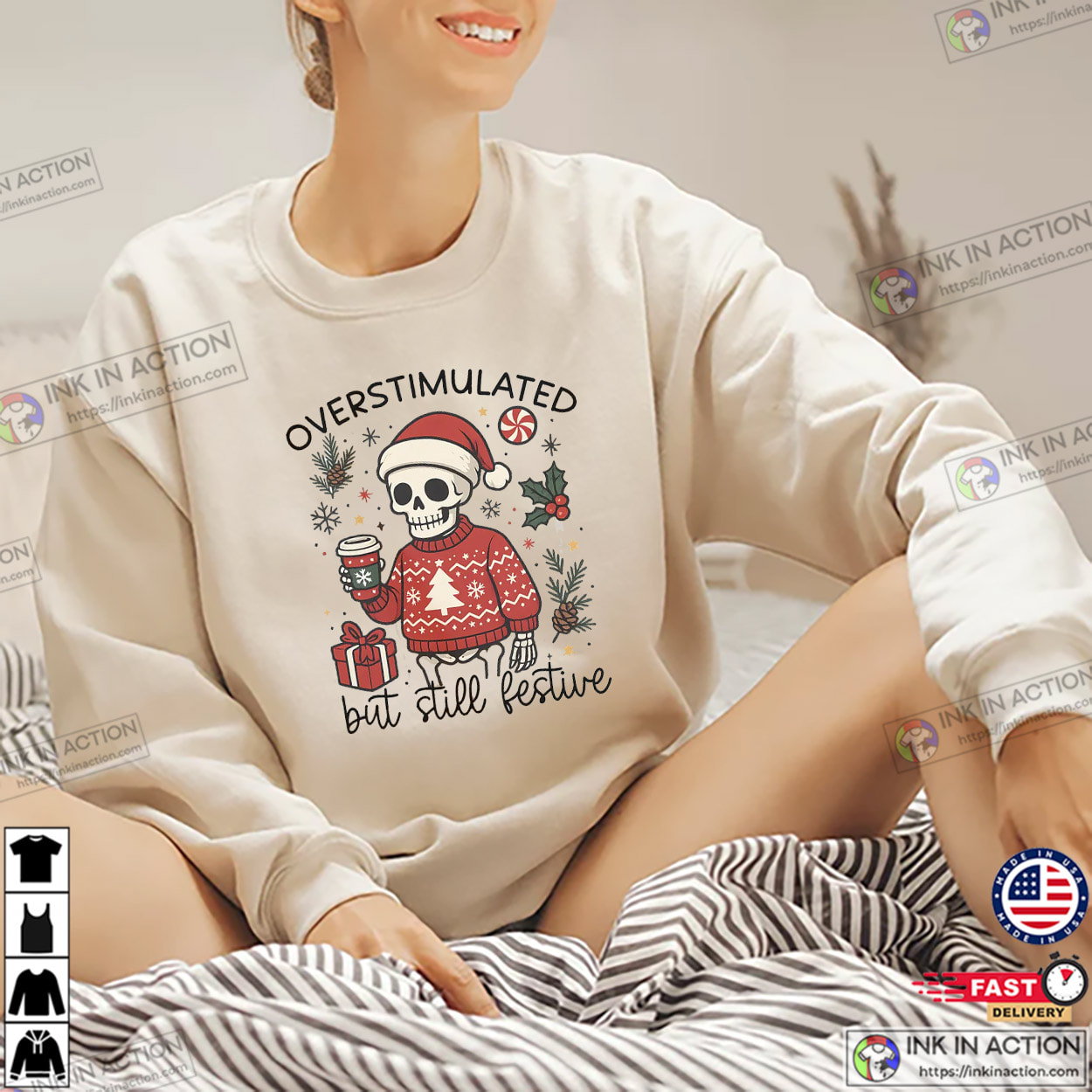 Overstimulated But Still Festive Funny Christmas Skeleton Shirt