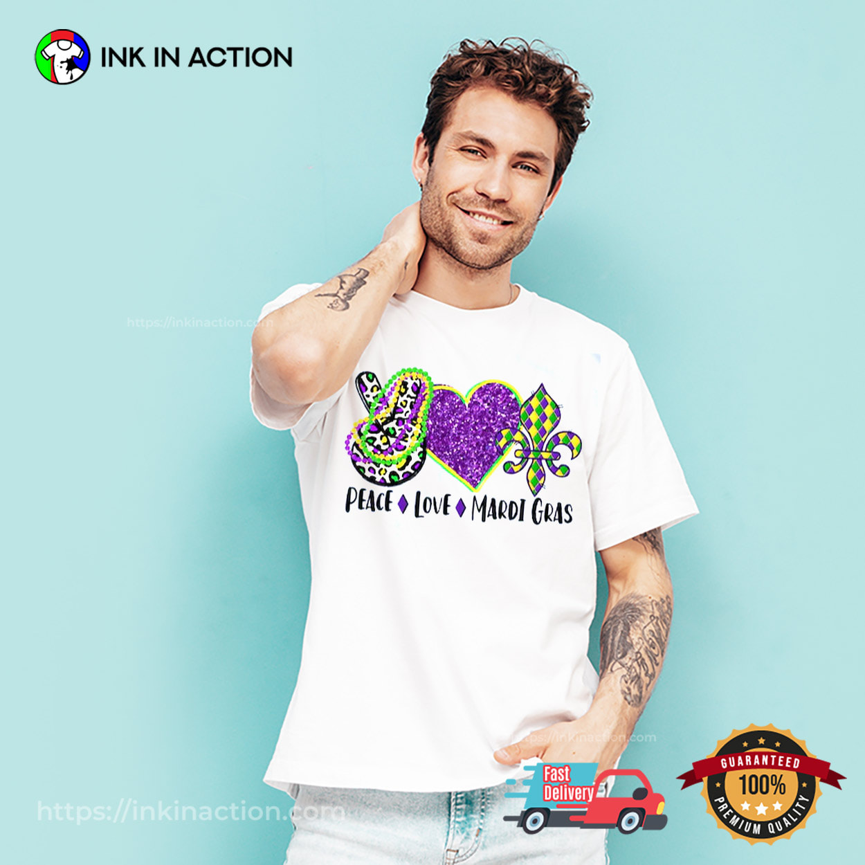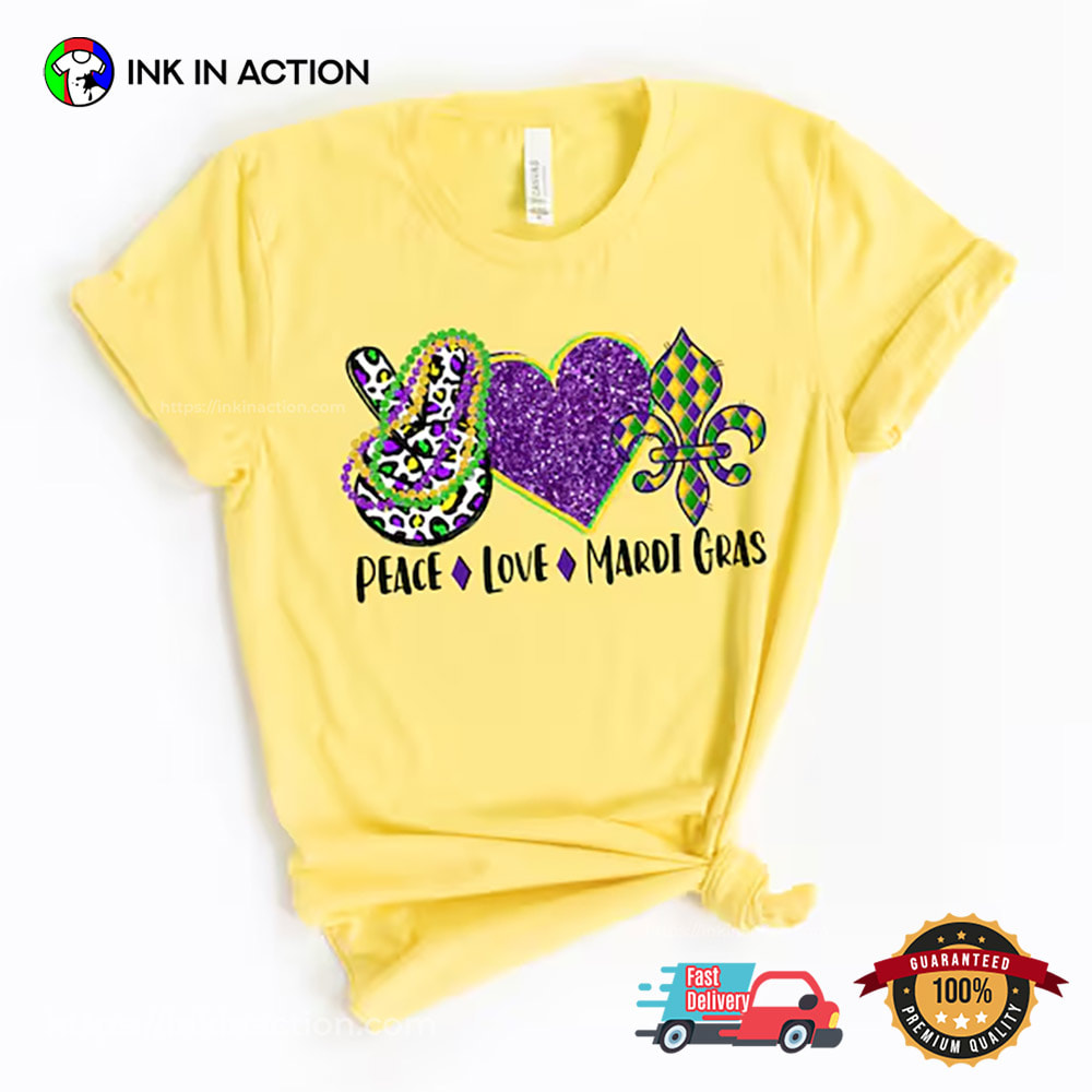 Are you ready to celebrate the holiday season with style and ease? Look no further! Our Peace Love Mardi Gras Love T-shirt, printed right here in the USA, offers affordable and practical options that will make your life stress-free and your celebrations unforgettable.