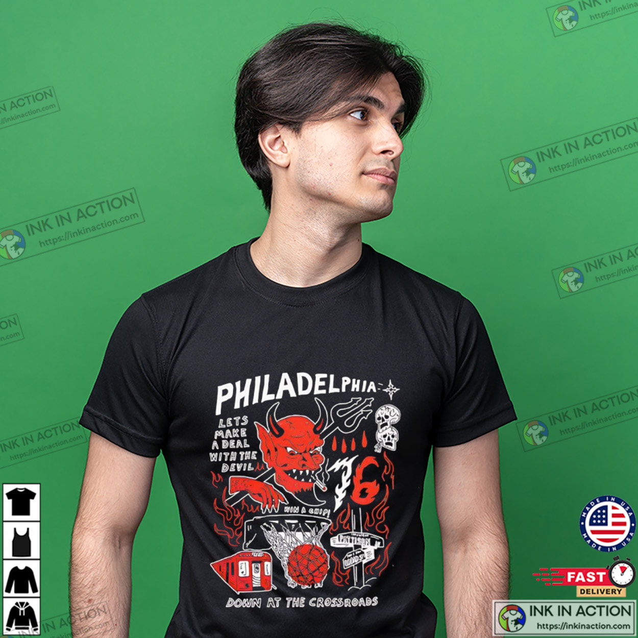 Welcome to Ink In Action, your go-to print-on-demand website for Philadelphia Lets Make A Deal With The Devil Down At The Crossroads T-shirt. We offer a wide selection of sports shirts for various sports enthusiasts, from golfers to basketball fans.
