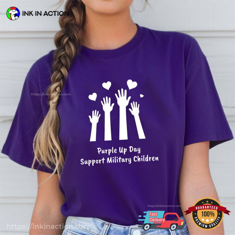 Our team prints each Purple Up Day Support Military Children Unisex T-shirt carefully. Our shirts are always soft and durable since we print with high-quality, water-based inks and employ traditional hand-screen printing procedures.