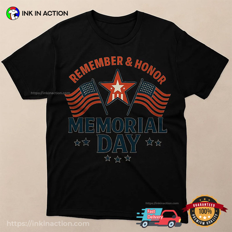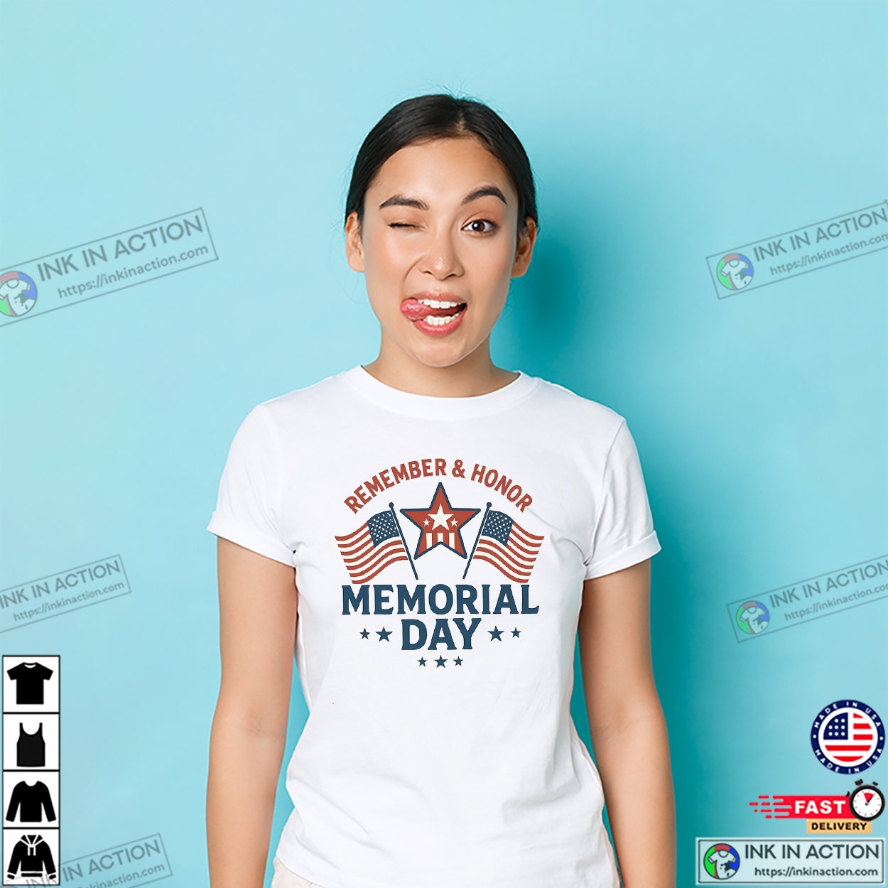 Are you ready to celebrate the holiday season with style and ease? Look no further! Our Remember And Honor Patriotic USA Memorial Day Tee, printed right here in the USA, offers affordable and practical options that will make your life stress-free and your celebrations unforgettable.