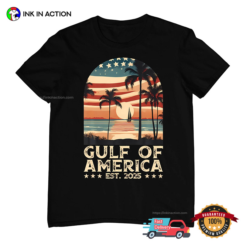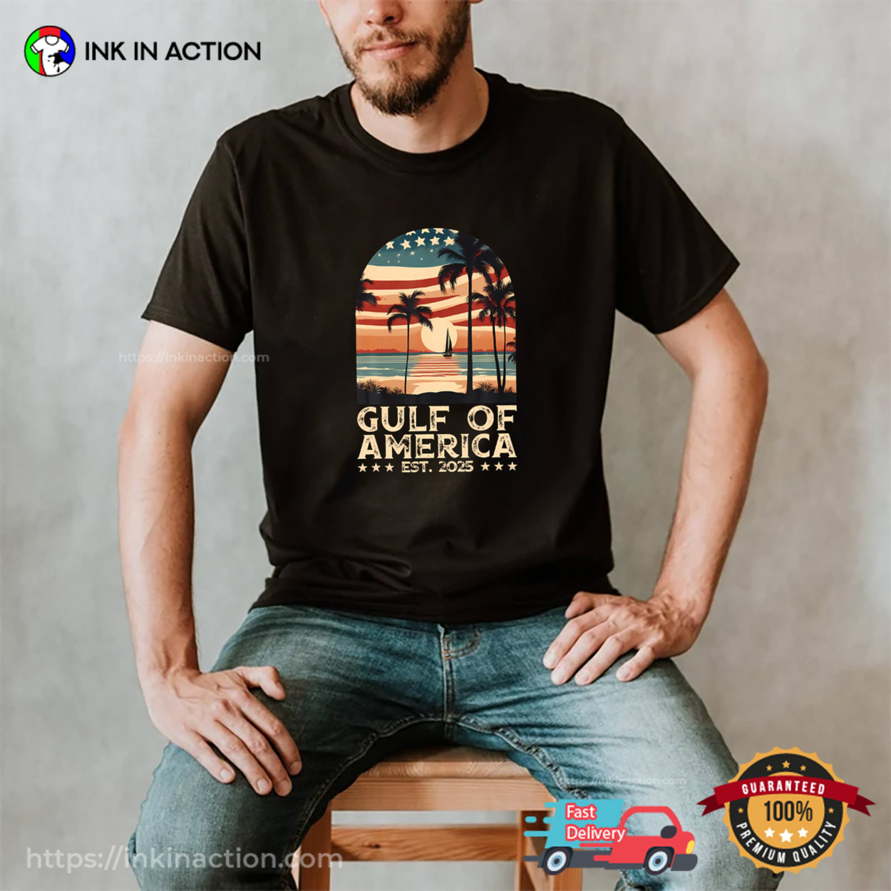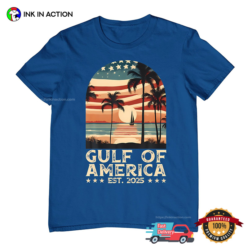 The Coastal region, Gulf of America, Gulf of Mexico, political category applies to this Retro Gulf Of America Est 2025 American Flag Sky T-shirt.